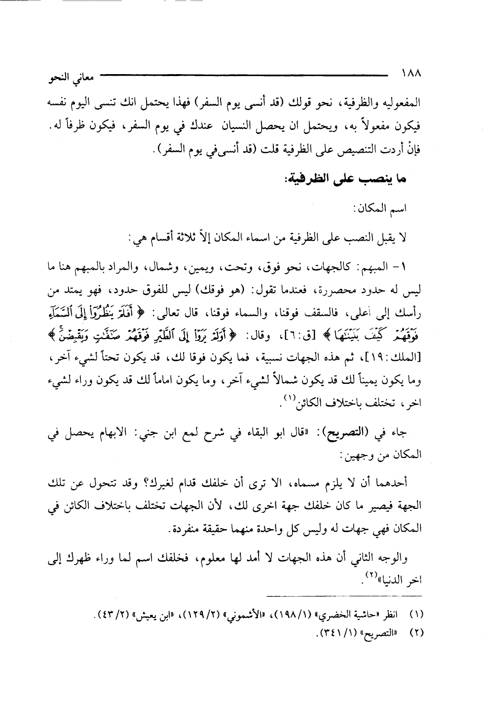 جاء في (التصريح): " قال أبو البقاء في شرح لمع ابن جني: الابهام يحصل في المكان من وجهين: