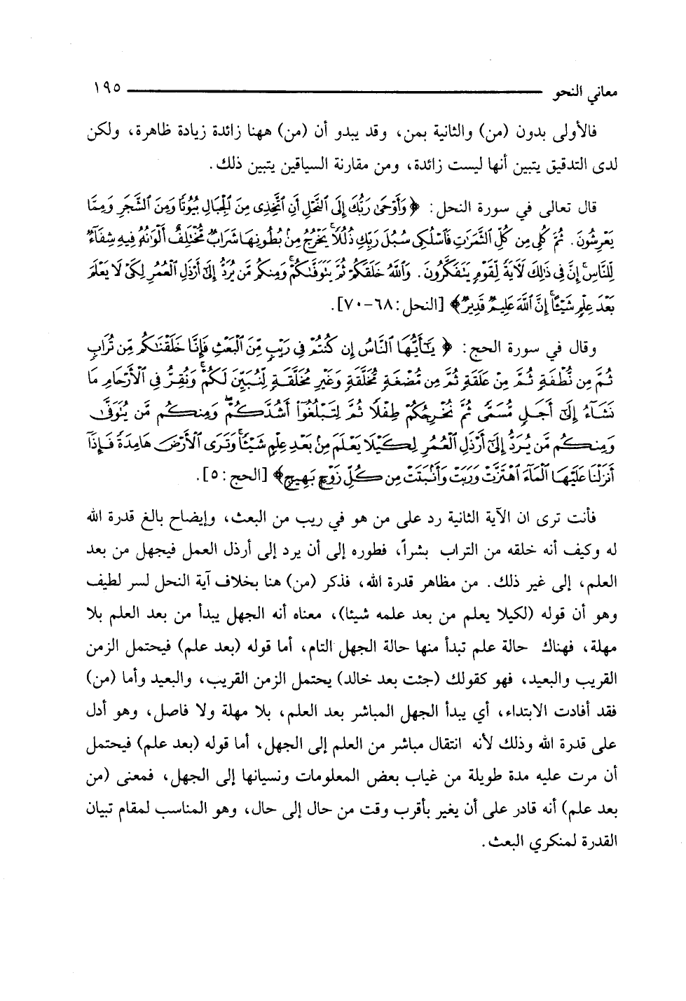 فأنت ترى أن الآية الثانية رد على من هو في ريب من البعث، وإيضاح بالغ قدرة الله له وكيف أنه خلقه من التراب بشرا فطوره إلى أن يرد إلى أرذل العمل فيجهل من بعد العلم، إلى غير ذلك، من مظاهر قدرة الله، فذكر (من) هنا بخلاف آية النحل لسر لطيف وهو أن قوله (لكيلا يعلم من بعد علمه شيئا) معناه أنه الجهل يبدأ من بعد العلم بلا مهلة، فهناك حالة علم تبدأ منها حالة الجهل التام، أما قوله (بعد علم) فيحتمل الزمن القريب والبعيد، فهو كقولك جئت بعد خالد، يحتمل الزمن القريب، والبعيد وأما من فقد أفادت الابتداء، أي يبدأ الجهل المباشر بعد العلم، بلا مهلة ولا فاصل، وهو أدل على قدرة الله وذلك لأنه انتقال مباشر من العلم إلى الجهل، أما قوله (بعد علم) فيحتمل أن مرت عليه مدة طويلة من غياب بعض المعلومات ونسيانها إلى الجهل، فمعنى (من بعد علم) أنه قادر على أن يغير بأقرب وقت من حال إلى حال، وهو المناسب لمقام تبيان القدرة لمنكري البعث.