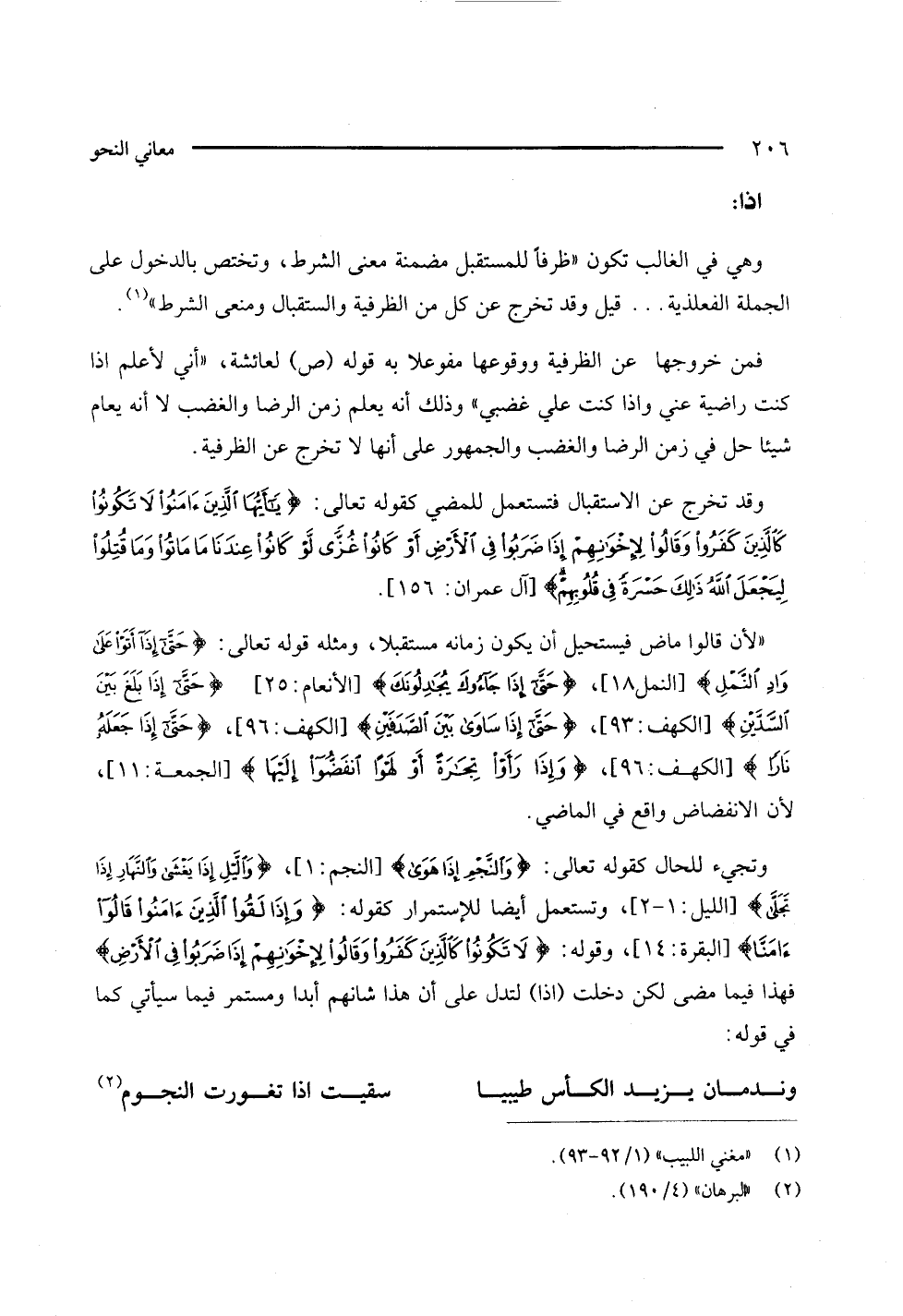 وتجيء للحال كقوله تعالى: {والنجم إذا هوى} [النجم: 1]، {واليل إذا يغشى والنهار إذا تجلى} [الليل: 1 - 2]، وتستعمل أيضا للاستمرار كقوله: {وإذا لقوا الذين أمنوا قالوا أمنا} [البقرة: 14]، وقوله {لا تكونوا كالذين كفروا وقالوا لإخوانهم إذا ضربوا في الأرض} فهذا فيما مضى لكن دخلت (إذا) لتدل على أن هذا شأنهم أبدا ومستمر فيما سيأتي كما في قوله: