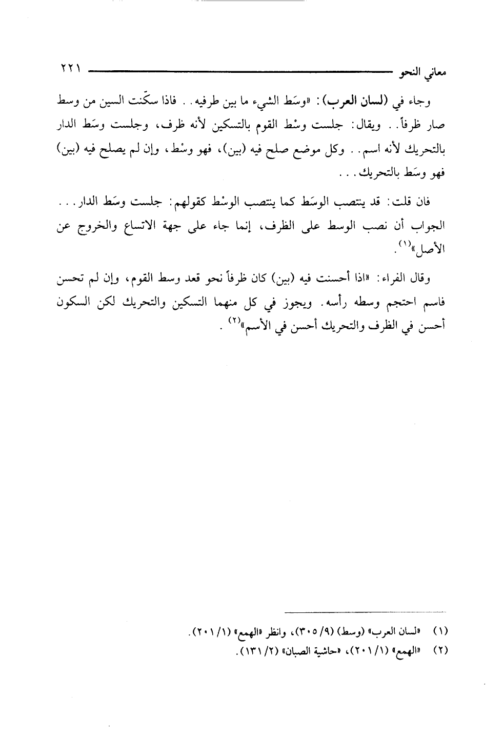 وقال الفراء: " إذا أحسنت فيه (بين) كان ظرفا نحو قعد وسط القوم، وإن لم تحسن فاسم احتجم وسطه رأسه، ويجوز في كل منهما التسكين والتحريك لكون السكون أحسن في الظرف والتحريك أحسن في الاسم" (¬2).