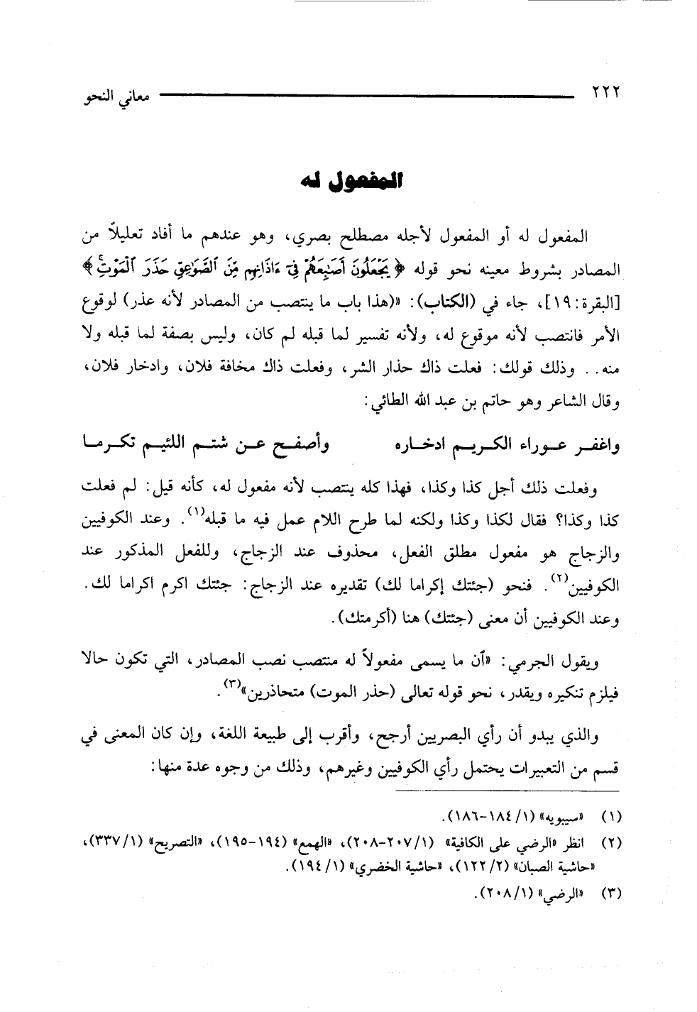 المفعول له أو المفعول لأجله مصطلح بصري، وهو عندهم ما أفاد تعليلا من المصادر بشروط، معينه نحو قوله {يجعلون أصابعهم في آذانهم من الصواعق حذر الموت} [البقرة: 19]، جاء في (الكتاب): " هذا باب ما ينتصب من المصادر لأنه عذر) لوقوع الأمر فانتصب لأنه مرفوع لهن ولأنه تفسير لما قبله لم كان، وليس بصفة لما قبله ولا منه .. وذلك قولك: فعلت ذاك حذار الشر، وفعلت ذاك مخافة فلان، وادخار فلان، وقال الشاعر وهو حاتم بن عبد الله الطائي: