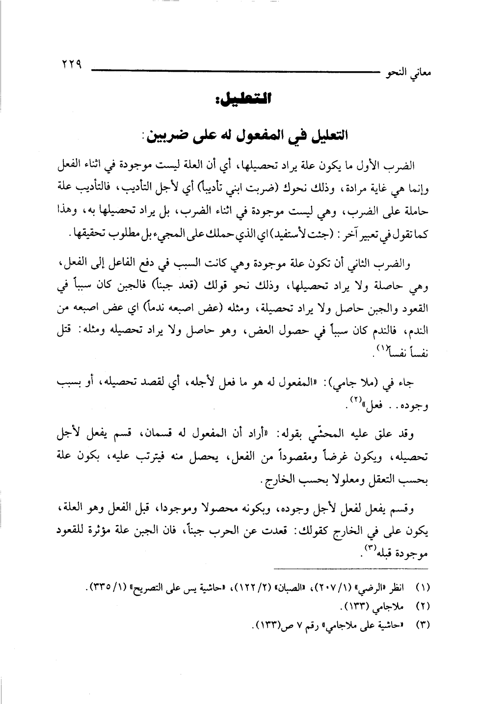 وقد علق عليه المحشي بقوله: " أراد أن المفعول له قسمان، قسم يفعل لأجل تحصيله، ويكون غرضا ومقصودا من الفعل، يحصل منه فيترتب عليه، بكون علة بحسب التعقل، ومعلولا بحسب الخارج.