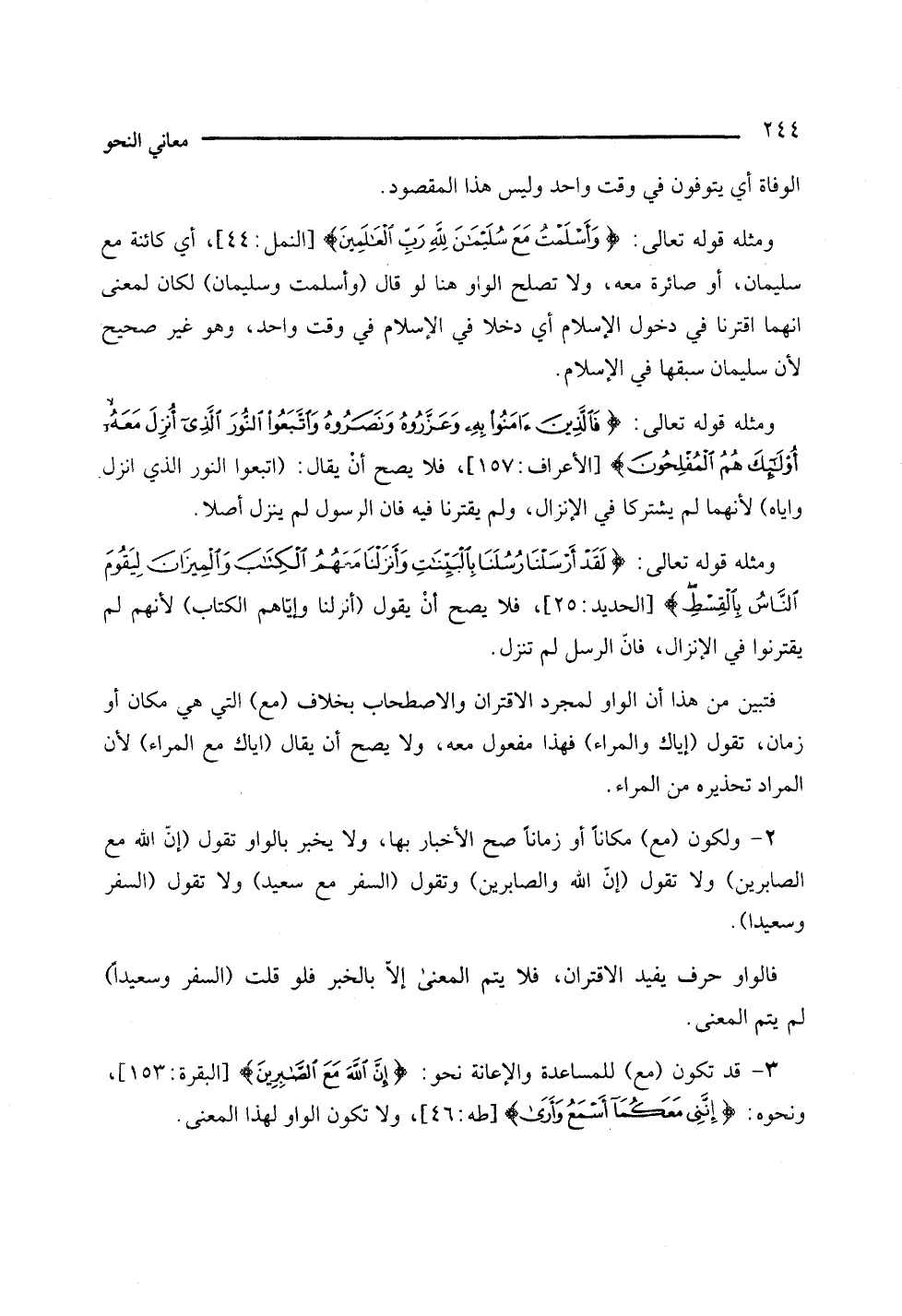 الوفاة أي يتوفون في وقت واحد وليس هذا المقصود. ومثله قوله تعالى: {وأسلمت مع سلمان لله رب العالمين} [النمل: 44]، أي كائنة مع سليمان، أو صائرة معه، ولا تصلح الواو هنا لو قال (وأسلمت وسلمان) لكان لمعنى أنهما اقترنا في دخول الاسلام أي دخلا في الاسلام في وقت واحد، وهي غير صحيح لأن سليمان سبقهما في الإسلام.