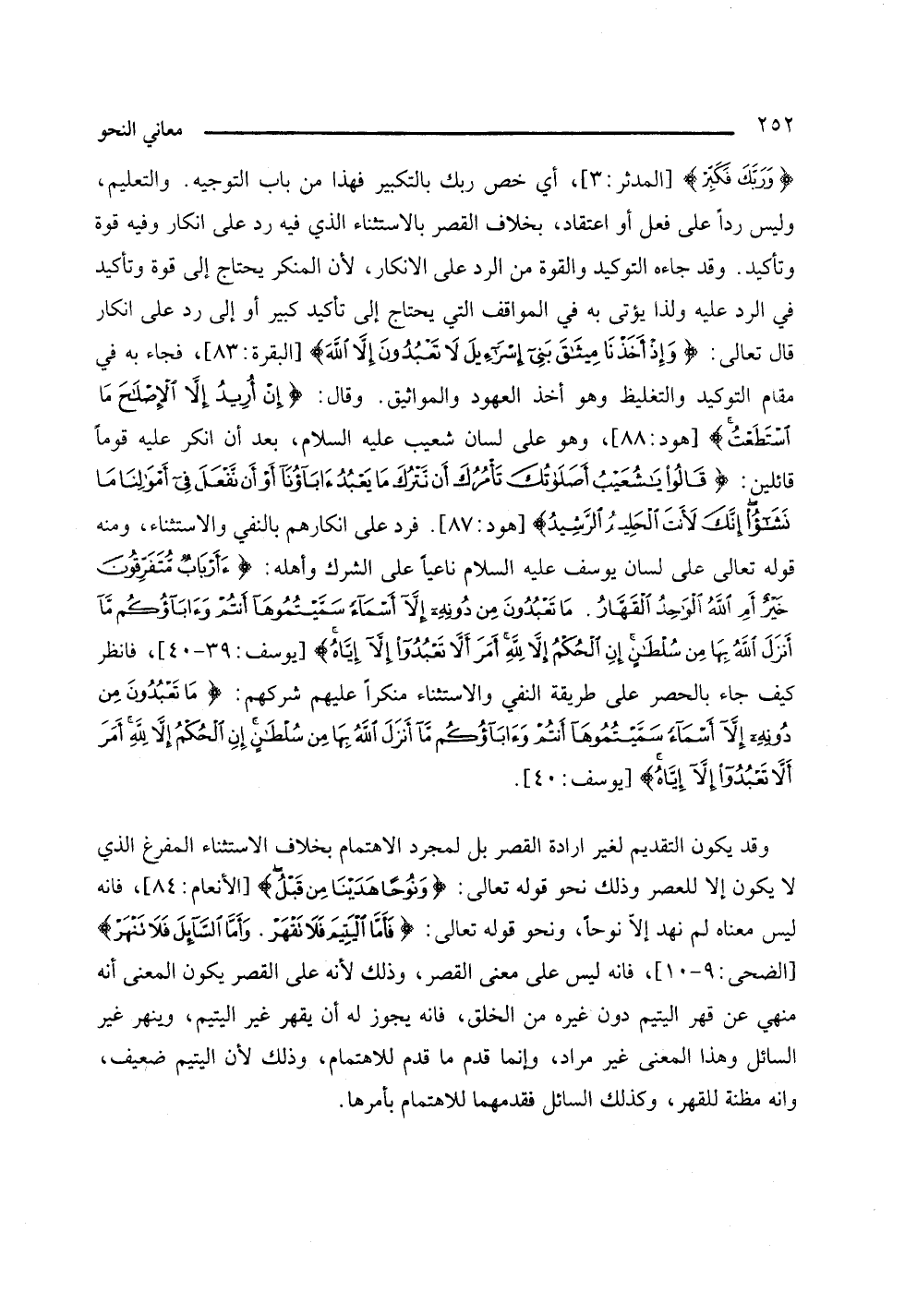 {وربك فكبر} [المدثر: 3]، أي خص ربك بالتكبير فهذا من باب التوجيه. والتعليم، وليس ردا على فعل أو اعتقاد بخلاف القصر بالاستثناء الذي فيه رد على إنكار وفيه قوة وتأكيد، وقد جاءه التوكيد والقوة من الرد على الإنكار. لأن المنكر يحتاج إلى قوة وتأكيد في الرد عليه ولذا يؤتى به في المواقف التي يحتاج إلى تأكيد كبير أو إلى رد على إنكار قال تعالى: {وإذ أخذنا ميثاق بني إسرائيل لا تعبدون إلا الله} [البقرة: 83]، فجاء به في مقام التوكيد والتغليظ وهو أخذ العهود المواثيق، وقال: {إن أريد إلا الإصلاح ما استطعت} [هود: 88]، وهو على لسان شعيب عليه السلام، بعد أن أنكر عليه قوما قائلين: {قالوا يا شعيب أصلواتك تأمرك أن نترك ما يعبد آباؤنا أو أن نفعل في أموالنا ما نشاء إنك لأنت الحليم الرشيد} [هود: 87]، فرد على إنكارهم بالنفي والاستثناء، ومنه قوله تعالى على لسان يوسف عليه السلام ناعيا على الشرك وأهله: {أأرباب متفرقون خير أم الله الواحد القهار، ما تعبدون من دونه إلا أسماء سميتموها أنتم أنتم وآباؤكم ما أنزل الله بها من سلطان إن الحكم إلا لله امر ألا تعبدون إلا إياه} [يوسف: 39 - 40]، فانظر كيف جاء بالحصر على طريقة النفي والاستثناء منكرا عليهم شركهم: {ما تعبدون من دونه إلا أسماء سميتوها أنتم وآباؤكم ما أنزل الله بها من سلطان إن الحكم إلا لله أمر ألا تعبدوا إلا إياه} [يوسف: 40].
