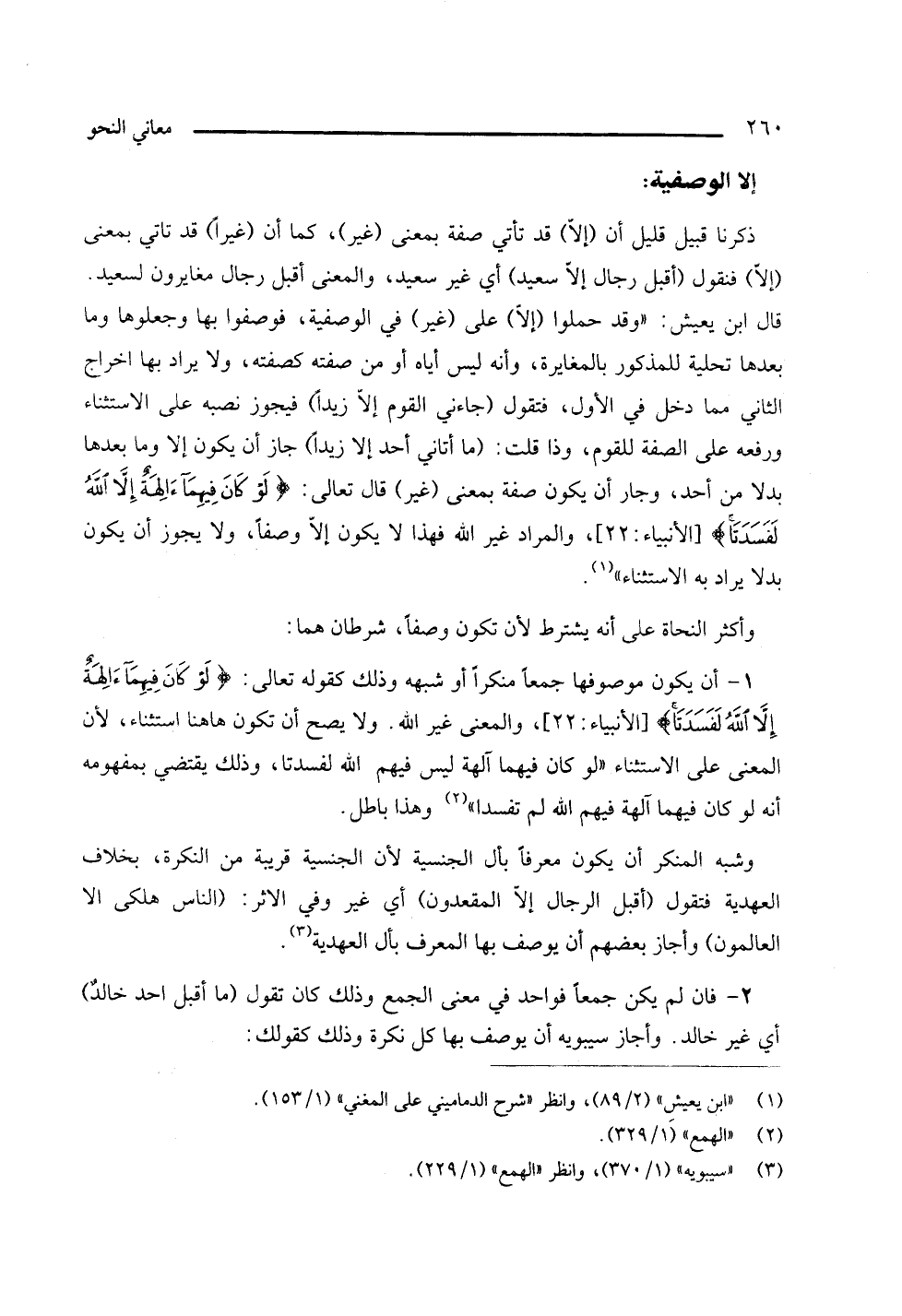 1 - أن يكون موصوفها جمعا منكرا أو شبهه وذلك كقوله تعالى: {لو كان فيها آلهة إلا الله لفسدتا} [الأنبياء: 22]، والمعنى غير الله، ولا يصح أن تكون ها هنا استثناء، لأن المعنى على الاستثناء " لو كان فيهما آلهة ليس فيهم الله لفسدتا، وذلك يقتضي بمفهومه أنه لو كان فيهما آلهة فيهم الله لم تفسدا (¬2) " وهذا باطل.