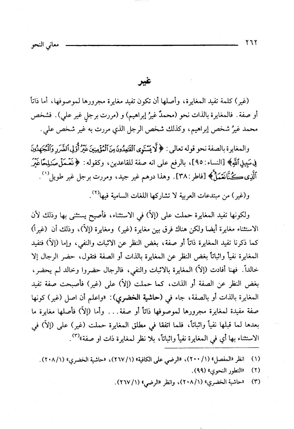 (غير) كلمة تفيد المغايرة، وأصلها أن تكون تفيد مغايرة مجرورها لموصوفها، أما ذاتا أو صفة. فالمغايرة بالذات نحو (محمدٌ غيرُ إبراهيم) و (مررت برجلٍ غير علي). فشخص محمد غيرُ شخص إبراهيم، وكذلك شخص الرجل الذي مررت به غير شخص علي.
