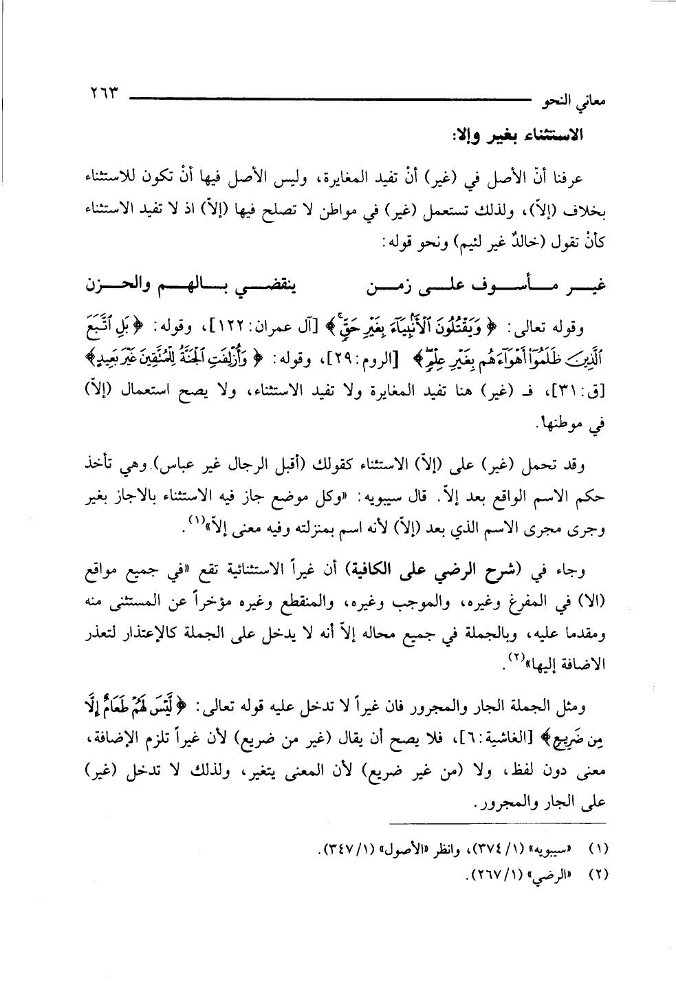 ومثل الجملة الجار والمجرور فإن غيرا لا تدخل عليه قوله تعالى: {ليس لهم طعام إلا من ضريع} [الغاشية: 6]، فلا يصح أن يقال (غير من ضريع)، لأن غيرا تلزم الإضافة، معنى دون لفظ، ولا (من غير ضريع)، لأن المعنى يتغير، ولذلك لا تدخل (غير) على الجار والمجرور.