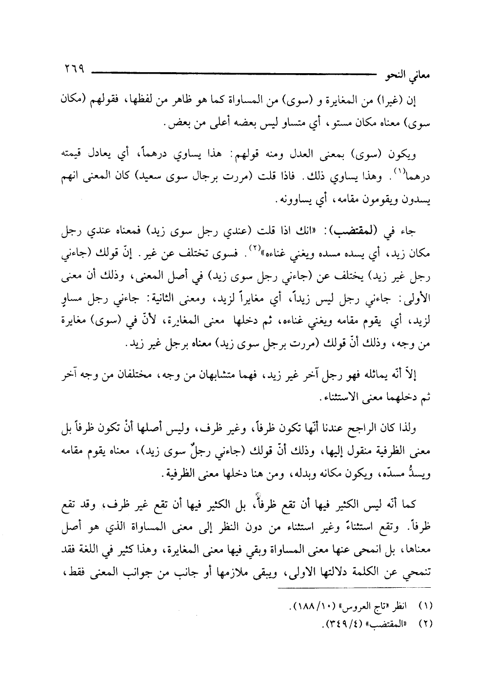 جاء في (المقتضب): " أنك إذا قلت (عندي رجل سوى زيد)، فمعناه عندي رجل مكان زيد، أي يسد مسده ويغني غناءه " (¬2) فسوف تختلف عن غير. إن قولك جاءني رجل غير زيد، يختلف عن جاءني رجل سوى زيد، في أصل المعنى، وذلك أن معنى الأولى: جاءني رجل ليس زيدا، أي مغايرا لزيد، ومعنى الثانية: جاءني رجل مساو لزيد، أي يقوم مقامه ويغني غناءه، ثم دخلها معنى المغايرة، لأن في (سوى) مغايرة من وجه، وذلك أن قولك (مررت برجل سوى زيد) معناه برجل غير رجل.
