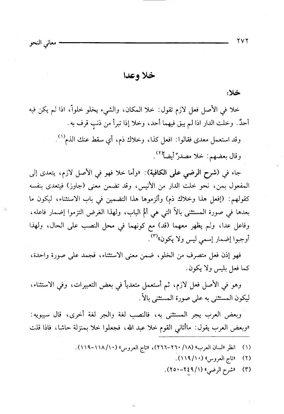 جاء في (شرح الرضي على الكافية): " وأما خلا فهو في الأصل لازم، يتعدى إلى المفعول بمن، نحو خلت الدار من الأنيس، وقد تضمن معنى (جاوز) فيتعدى بنفسه كقولهم: (إفعل هذا وخلاك ذم) وألزموها هذا التضمين في باب الاستثناء، ليكون ما بعدها في صورة المستثنى بإلا التي هي أم الباب، ولهذا الغرض التزموا إضمار فاعله، وفاعل عدا، ولم يظهر معهما (قد) مع كونهما في محل النصب على الحال، ولهذا أوجبوا إضمار إسمي ليس ولا يكون" (¬3).