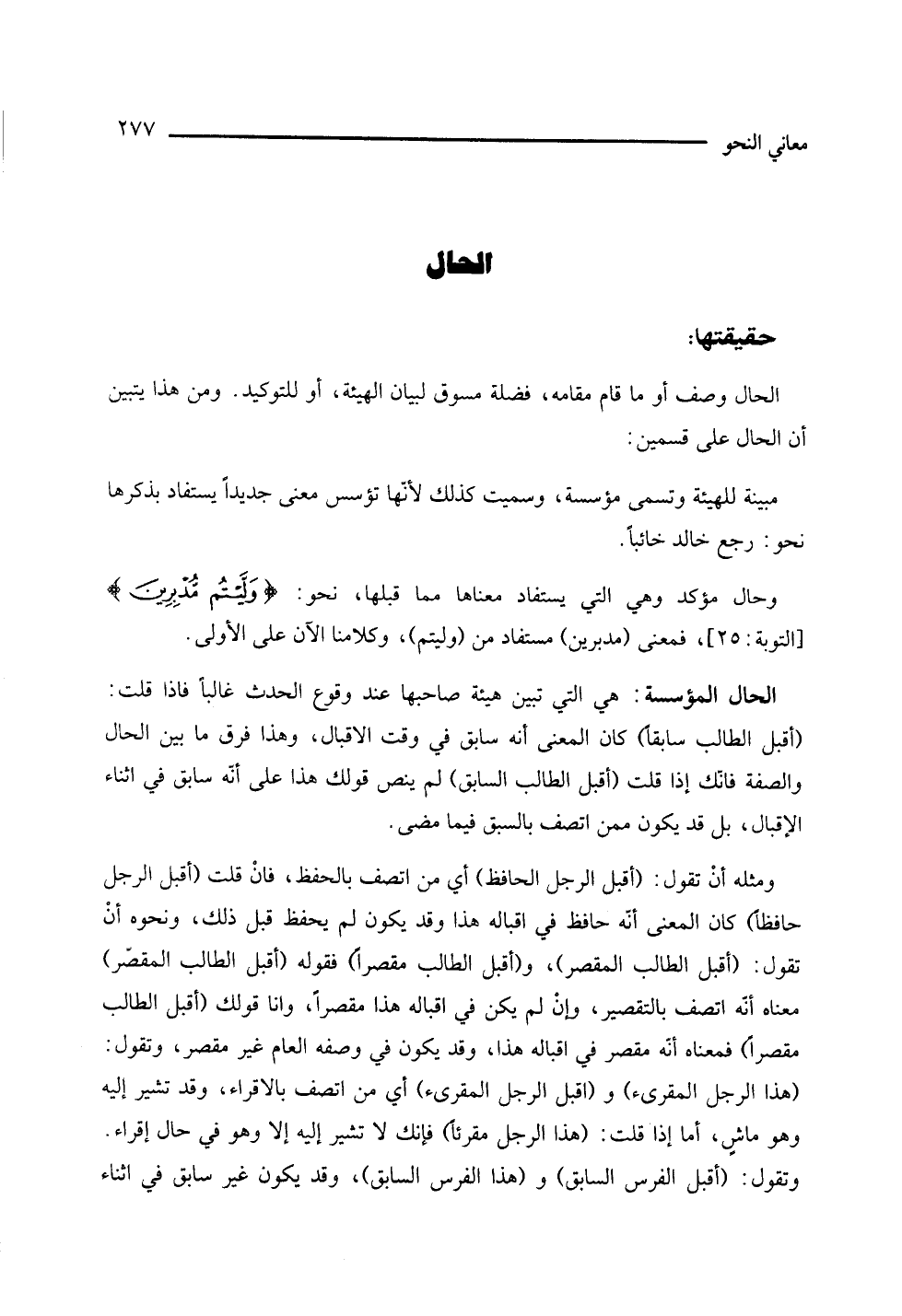 ومثله أن تقول: (أقبل الرجال الحافظ) أي من اتصف بالحفظ، فإن قلت (أقبل الرجل حافظا) كان المعنى أنه حافظ في إقباله هذا وقد يكون لم يحفظ قبل ذلك، ونحوه أن تقول: (أقبل الطالب المقصر)، و (أقبل الطالب مقصرا) فقوله (أقبل الطالب المقصر) معناه أنه اتصف بالتقصير، وإن لم يكن في إقباله هذا مقصرًا، واما قولك (أقبل الطالب مقصرا) فمعناه أنه مقصر في إقباله هذا، وقد يكون في وصفه العام غير مقصر، وتقول: هذا الرجل المقريء، وأقبل الرجل المقريء، أي من اتصف بالاقراء، وقد تشير إليه وهو ماش، أما إذا قلت: (هذا الرجل مقرئا) فإنك لا تشير إليه إلا وهو في حال إقراء، وتقول: (أقبل الفرس السابق)، و (هذا الفرس السابق) وقد يكون غير سابق في أثناء