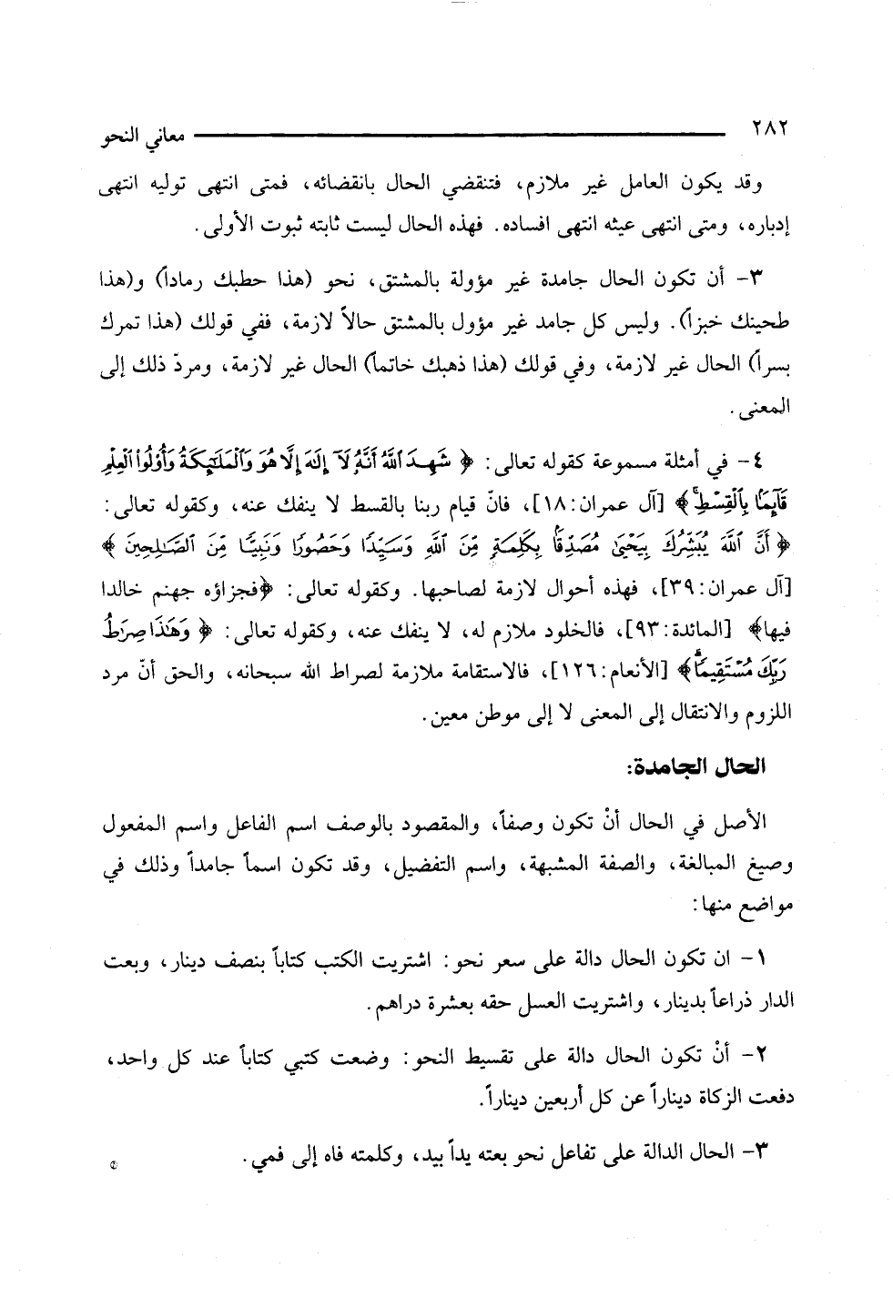 4 - في أمثلة مسموعة كقوله تعالى: {شهد الله أنه لا إله إلا هو والملائكة وأولوا العلم قائما بالقسط} [آل عمران: 18]، فإن قيام ربنا بالقسط لا ينفك عنه، وكقوله تعالى: {أن الله يبشرك بيجيى مصدقا بكلمة من الله وسيدا وحصورا ونبيا من الصالحين} [اآل عمران: 39]، فهذه أحوال لازمة لصاحبها، وكقوله تعالى: {فجزاؤه جهنم خالد فيها} [المائدة: 93]، فالخلود ملازم له، لا ينفك عنه، وكقوله تعالى: {وهذا صراط ربك مستقيما} [الأنعام: 126]، فالاستقامة ملازمة لصراط الله سبحانه، والحق أن مرد اللزوم والانتقال إلى المعنى لا إلى موطن معن.