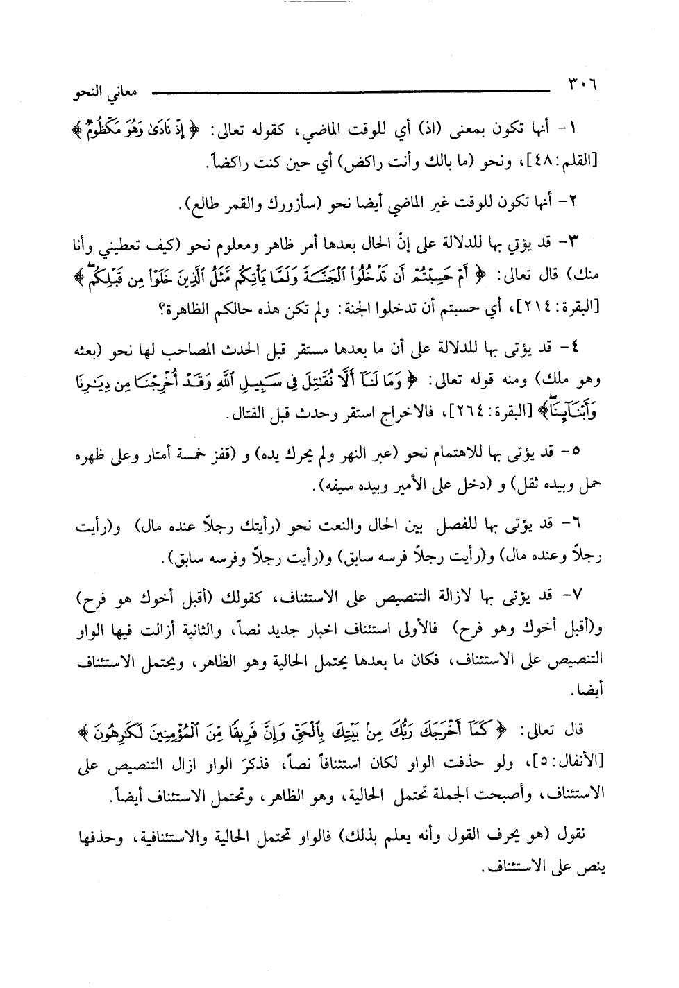 قال تعالى: {كما أخرج ربك من بيتك بالحق وإن فريقا من المؤمنين لكارهون} [الأنفال: 5]، ولو حذفت الواو لكان اسئتنافا نصا، فذكر الواو أزال التنصيص على الاستئناف، وأصبحت الجملة تحتمل الحالية وهو الظاهر وتحتمل الاستئناف أيضا.