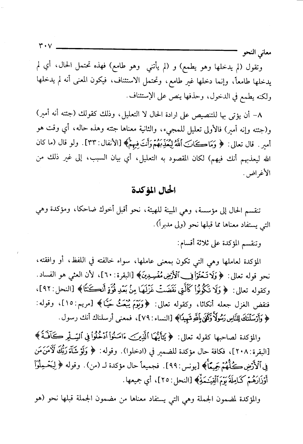 والمؤكدة لصاحبها كقوله تعالى: {يأيها الذين أمنوا أدخلوا في السلم كافة} [البقرة: 208]، فكافة حال مؤكدة للضمير في (ادخلوا) وقوله: {ولو شاء ربك لأن من في الأرض كلهم جميعا} [يونس: 99]، فجميعا حال مؤكدة لـ (من). وقوله: {ليحملوا أوزارهم كاملة يوم القيامة} [النحل: 25]، أي جميعها.