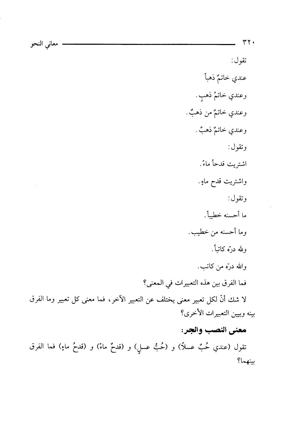 واشتريت قدح ماءٍ، وتقول: ما أحسنه خطيبًا. وما أحسنه من خطيب، ولله دره كاتبا والله دره من كاتب.