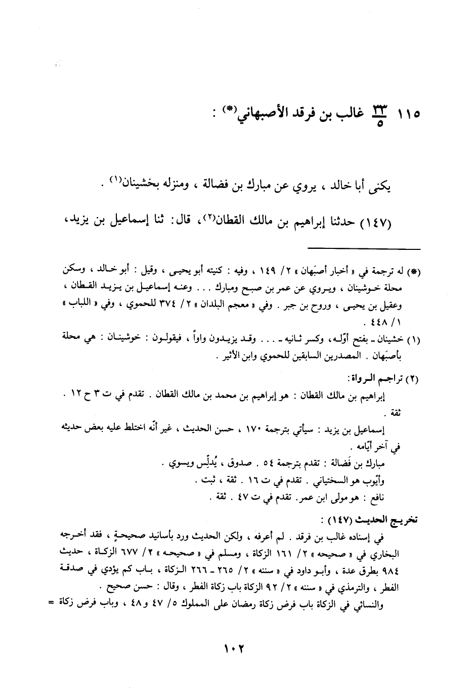 §115 - غَالِبُ بْنُ فَرْقَدٍ الْأَصْبَهَانِيُّ يُكْنَى أَبَا خَالِدٍ , يَرْوِي عَنْ مُبَارَكِ بْنِ فَضَالَةَ , وَمَنْزِلُهُ بِخَشِينَانَ