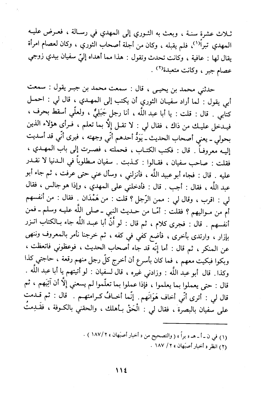 حَدَّثَنِي مُحَمَّدُ بْنُ يَحْيَى , قَالَ: سَمِعْتُ مُحَمَّدَ بْنَ جَبْرٍ , يَقُولُ: سَمِعْتُ أَبِي , يَقُولُ: §" لَمَّا أَرَادَ سُفْيَانُ الثَّوْرِيُّ أَنْ يَكْتُبَ إِلَى الْمَهْدِيِّ قَالَ لِي: احْمِلْ كِتَابِي , قَالَ: قُلْتُ: يَا أَبَا عَبْدِ اللَّهِ , أَنَا رَجُلٌ جَبَلِيُّ , وَلِعَلِيِّ أَسْقُطُ بِحَرْفٍ فَيَدْخُلُ عَلَيْكَ مِنْ ذَاكَ , فَقَالَ لِي: لَا تَقُلْ إِلَّا بِمَا تَعْلَمُ , فَرَأَى هَؤُلَاءِ الَّذِينَ بِحَوْلِي , يَعْنِي أَصْحَابَ الْحَدِيثِ , يَوَدُّ أَحَدُهُمْ أَنِّي وَجَّهْتُهُ , فَيَرَى أَنِّي قَدْ أَسْدَيْتُ إِلَيْهِ مَعْرُوفًا , قَالَ: فَكَتَبَ الْكِتَابَ فَحَمَلْتُهُ , فَصِرْتُ إِلَى بَابِ الْمَهْدِيِّ , فَقُلْتُ: صَاحِبُ سُفْيَانَ , فَقَالُوا: كَذَبْتَ , سُفْيَانُ مَطْلُوبًا فِي الدُّنْيَا , لَا نَقْدِرُ عَلَيْهِ , قَالَ: فَجَاءَ أَبُو عُبَيْدِ اللَّهِ فَأَنْزَلَنِي وَسَأَلَ عَنِّي حَتَّى عُرِفْتُ , ثُمَّ جَاءَ أَبُو عَبْدِ اللَّهِ فَقَالَ: أَجِبْ , قَالَ: فَأَدْخَلَنِي عَلَى الْمَهْدِيِّ , وَإِذَا هُوَ جَالِسٌ , فَقَالَ لِي: اقْرُبْ , وَقَالَ لِي: مِمَّنِ الرَّجُلُ؟ قُلْتُ: مِنْ هَمْدَانَ , فَقَالَ: مِنْ أَنْفُسِهِمْ , أَمْ مِنْ مَوَالِيهِمْ؟ , فَقُلْتُ: أَمَّا مِنْ حَدِيثِ النَّبِيِّ صَلَّى اللهُ عَلَيْهِ وَسَلَّمَ فَمِنْ أَنْفُسِهِمْ , قَالَ: فَجَرَى كَلَامٌ , ثُمَّ قَالَ: لَوْ أَنَّ أَبَا عَبْدِ اللَّهِ جَاءَ بِالْكِتَابِ اتَّزَرَ بِإِزَارٍ , وَارْتَدَى بِأُخْرَى , فَأَضَعُ كَفِّي فِي كَفِّهِ , ثُمَّ خَرَجْنَا نَأْمُرُ بِالْمَعْرُوفِ , وَنَنْهَى عَنِ الْمُنْكَرِ , ثُمَّ قَالَ: أَمَا إِنَّهُ قَدْ جَاءَ أَصْحَابُ الْحَدِيثِ فَوَعَظُونِي فَاتَّعَظْتُ , وَبَكَوْا فَبَكَيْتُ مَعَهُمْ , فَمَا كَانَ بِأَسْرَعَ أَنْ أَخْرَجَ كُلُّ رَجُلٍ مِنْهُمْ رُقْعَةً: حَاجَتِي كَذَا وَكَذَا " قَالَ أَبُو عَبْدِ اللَّهِ: وَزَادَنِي غَيْرُهُ , قَالَ لِسُفْيَانَ: لَوْ أَتَيْتَهُمْ يَا أَبَا عَبْدِ اللَّهِ , قَالَ: حَتَّى يَعْمَلُوا بِمَا يَعَلَمُوا , فَإِذَا عَمِلُوا بِمَا تَعَلَّمُوا لَمْ يَسَعْنِي إِلَّا أَنْ آتِيَهُمْ , ثُمَّ قَالَ لِي: أَتَرَى أَنِّي أَخَافُ هَوَانَهُمْ , إِنَّمَا أَخَافُ كَرَامَتَهُمْ , قَالَ: ثُمَّ قَدِمْتُ عَلَى سُفْيَانَ بِالْبَصْرَةِ , فَقَالَ لِي: الْحَقْ بِأَهْلِكَ , وَالْحَقْنِي بِالْكُوفَةِ , فَقَدِمْتُ