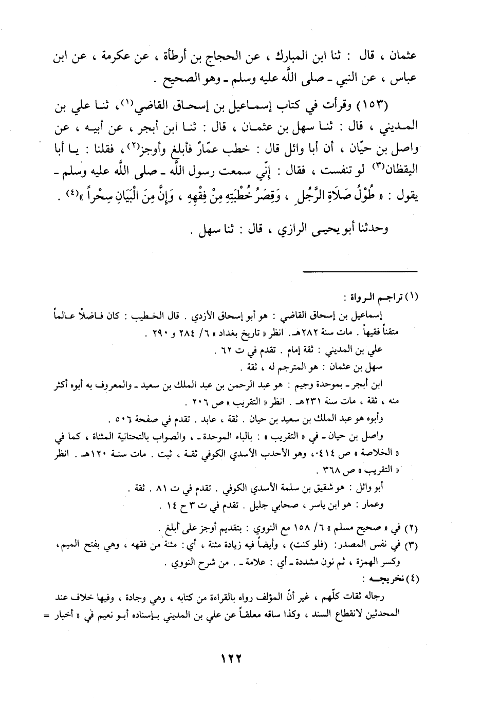 وَقَرَأْتُ فِي كِتَابِ إِسْمَاعِيلَ بْنِ إِسْحَاقَ الْقَاضِي , ثنا عَلِيُّ بْنُ الْمَدِينِيِّ , قَالَ: ثنا سَهْلُ بْنُ عُثْمَانَ , قَالَ: ثنا ابْنُ أَبْجَرَ , عَنْ أَبِيهِ , عَنْ وَاصِلِ بْنِ حَيَّانَ , أَنَّ أَبَا وَائِلٍ , قَالَ: خَطَبَ عَمَّارٌ , فَأَبْلَغَ وَأَوْجَزَ , فَقُلْنَا: يَا أَبَا الْيَقْظَانِ , لَوْ تَنَفَّسْتَ؟ فَقَالَ: إِنِّي سَمِعْتُ رَسُولَ اللَّهِ صَلَّى اللهُ عَلَيْهِ وَسَلَّمَ يَقُولُ: §«طُولُ صَلَاةِ الرَّجُلِ , وَقِصَرُ خُطْبَتِهِ مِنْ فَقْهِهِ , وَإِنَّ مِنَ الْبَيَانِ سِحْرًا» وَحَدَّثَنَا أَبُو يَحْيَى الرَّازِيُّ , قَالَ: ثنا سَهْلٌ