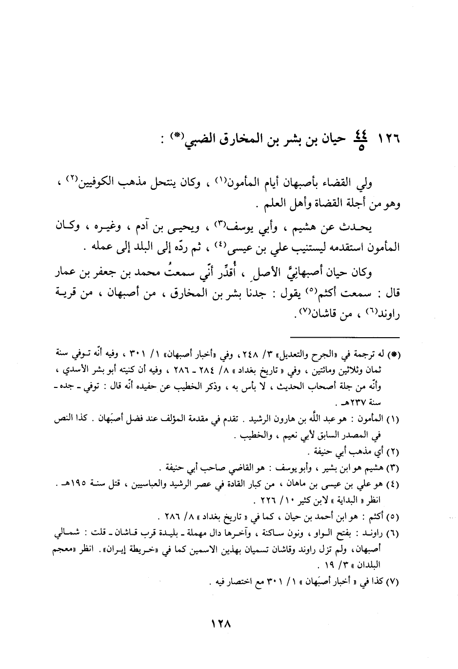 §126 - حَيَّانُ بْنُ بِشْرِ بْنِ الْمُخَارِقِ الضَّبِّيُّ وَلِيَ الْقَضَاءَ بأَصْبَهَانَ أَيَّامَ الْمَأْمُونِ , وَكَانَ يَنْتَحِلُ مَذْهَبَ الْكُوفِيِّينَ , وَهُوَ مِنْ أَجِلَّةِ الْقُضَاةِ وَأَهْلِ الْعِلْمِ , يُحَدِّثُ عَنْ هُشَيْمٍ , وَأَبِي يُوسُفَ , وَيَحْيَى بْنِ آدَمَ , وَغَيْرِهِ , وَكَانَ الْمَأْمُونُ اسْتَقْدَمَهُ لِيَسْتَنِيبَ عَلِيَّ بْنَ عِيسَى , ثُمَّ رَدَّهُ إِلَى الْبَلَدِ إِلَى عَمَلِهِ. وَكَانَ حَيَّانُ أَصْبَهَانِيَّ الْأَصْلِ , أُقَدِّرُ أَنِّي سَمِعْتُ مُحَمَّدَ بْنَ جَعْفَرِ بْنِ عَمَّارٍ قَالَ: سَمِعْتُ أَكْثَمَ يَقُولُ: جَدُّنَا بِشْرُ بْنُ الْمُخَارِقِ مِنْ أَصْبَهَانَ , مِنْ قَرْيَةِ رَاوَنْدَ مِنْ قَاشَانَ -[129]- وَمِنْ حِسَانِ حَدِيثِهِ