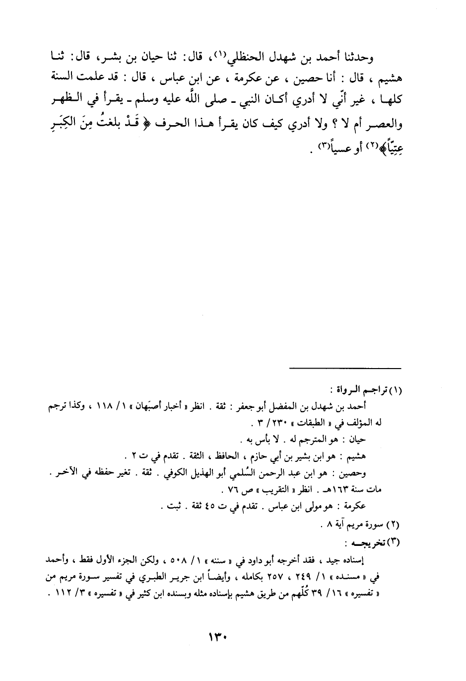 وَحَدَّثَنَا أَحْمَدُ بْنُ شَهْدَلٍ الْحَنْظَلِيُّ , قَالَ: ثنا حَيَّانُ بْنُ بِشْرٍ , قَالَ: ثنا هُشَيْمٌ , قَالَ: أَنَا حُصَيْنٌ , عَنْ عِكْرِمَةَ , عَنِ ابْنِ عَبَّاسٍ , قَالَ: §" قَدْ عَلِمْتُ السُّنَّةَ كُلَّهَا , غَيْرَ أَنِّي لَا أَدْرِي أَكَانَ النَّبِيُّ صَلَّى اللهُ عَلَيْهِ وَسَلَّمَ يَقْرَأُ فِي الظُّهْرِ وَالْعَصْرِ أَمْ لَا , وَلَا أَدْرِي كَيْفَ كَانَ يَقْرَأُ هَذَا الْحَرْفَ {قَدْ بَلَغْتُ مِنَ الْكِبَرِ عِتِيًّا} [مريم: 8] أَوْ عُسِيًّا "