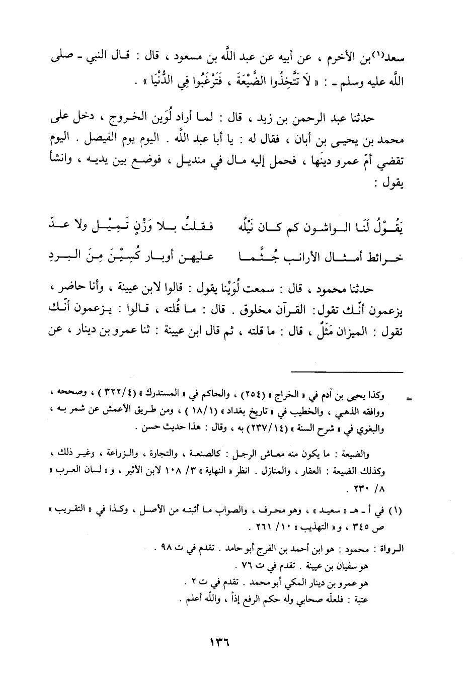 حَدَّثَنَا مَحْمُودٌ , قَالَ: سَمِعْتُ لُوَيْنًا , يَقُولُ: قَالُوا لِابْنِ عُيَيْنَةَ , وَأَنَا حَاضِرٌ: يَزْعُمُونَ أَنَّكَ تَقُولُ: الْقُرْآنُ مَخْلُوقٌ , قَالَ: مَا قُلْتُهُ , قَالُوا: يَزْعُمُونَ أَنَّكَ تَقُولُ: الْمِيزَانُ مَثَلٌ , قَالَ: مَا قُلْتُهُ , ثُمَّ قَالَ ابْنُ عُيَيْنَةَ ,: ثنا عَمْرُو بْنُ دِينَارٍ , عَنْ عُتْبَةَ قَالَ: §«يُجَاءُ بِالرَّجُلِ الْعَظِيمِ الطَّوِيلِ فَيُوضَعُ فِي الْمِيزَانِ , فَلَا يَزِنُ عِنْدَ اللَّهِ جَنَاحَ بَعُوضَةٍ»