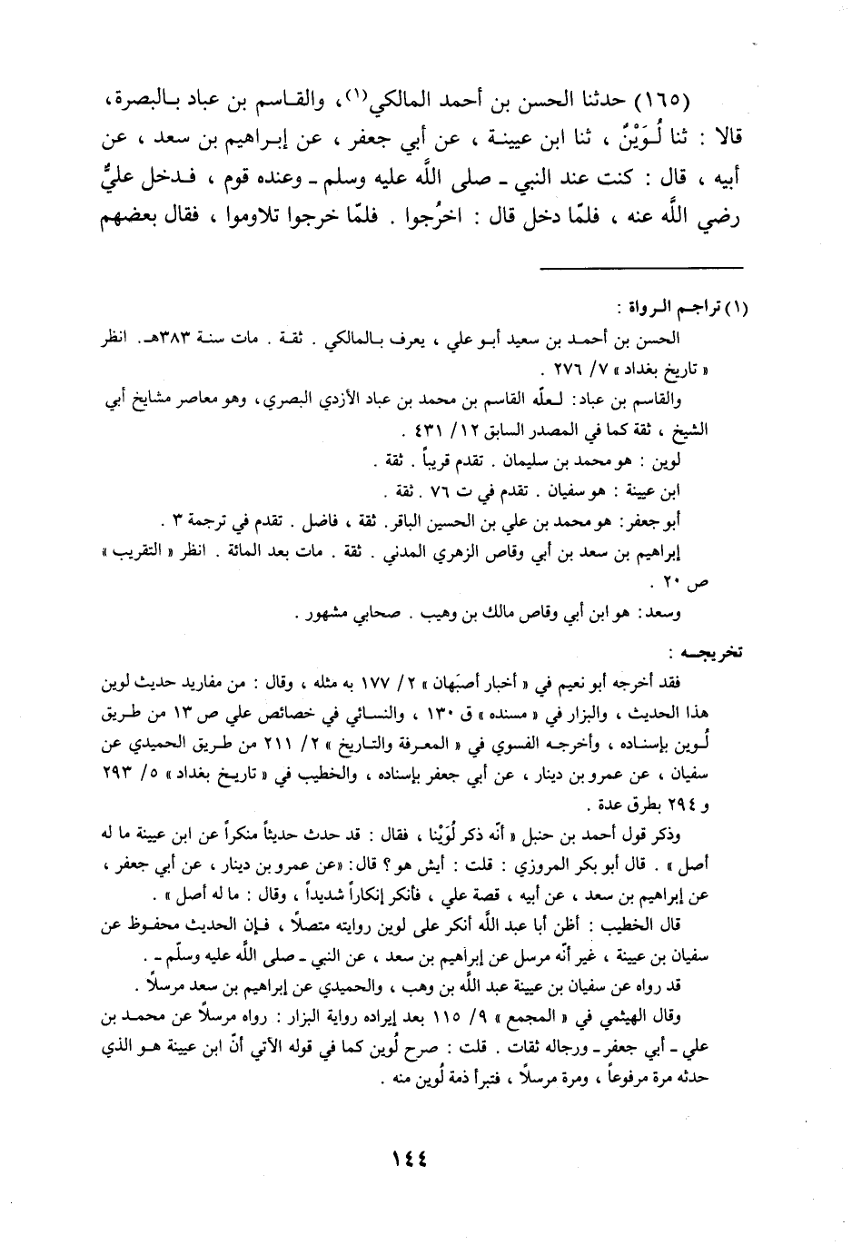 حَدَّثَنَا الْحَسَنُ بْنُ أَحْمَدَ الْمَالِكِيُّ , وَالْقَاسِمُ بْنُ عَبَّادٍ , بِالْبَصْرَةِ قَالَا: ثنا لُوَيْنٌ , ثنا ابْنُ عُيَيْنَةَ , عَنْ أَبِي جَعْفَرٍ , عَنْ إِبْرَاهِيمَ بْنِ سَعْدٍ , عَنْ أَبِيهِ , قَالَ: كُنْتُ عِنْدَ النَّبِيِّ صَلَّى اللهُ عَلَيْهِ وَسَلَّمَ , وَعِنْدَهُ قَوْمٌ , فَدَخَلَ عَلِيٌّ رَضِيَ اللَّهُ عَنْهُ , فَلَمَّا دَخَلَ قَالَ: «اخْرُجُوا» , فَلَمَّا خَرَجُوا تَلَاوَمُوا , فَقَالَ بَعْضُهُمْ لِبَعْضٍ: وَاللَّهِ مَا أَخْرَجَنَا , فَارْجِعُوا , فَقَالَ النَّبِيُّ صَلَّى اللهُ عَلَيْهِ وَسَلَّمَ: «وَاللَّهِ §مَا أَدْخَلْتُهُ وَأَخْرَجْتُكُمْ , وَلَكِنَّ اللَّهَ عَزَّ وَجَلَّ أَدْخَلَهُ وَأَخْرَجَكُمْ» قَالَ لُوَيْنٌ: ثنا بِهِ ابْنُ عُيَيْنَةَ مَرَّةً أُخْرَى , عَنْ إِبْرَاهِيمَ بْنِ سَعْدِ بْنِ أَبِي وَقَّاصٍ , لَمْ يُجَاوِزْ بِهِ حَدَّثَنَا بِهَذَا الْحَدِيثِ أَبُو بَكْرٍ الْبَزَّارُ , ثنا إِبْرَاهِيمُ بْنُ عَبْدِ اللَّهِ بْنِ الْجُنَيْدِ , ثنا مُحَمَّدُ بْنُ سُلَيْمَانَ الْأَسَدِيُّ , قَالَ الْبَزَّارُ: هَكَذَا يَرْوِيهِ مُحَمَّدُ بْنُ سُلَيْمَانَ , غَيْرُ مُحَمَّدِ بْنِ سُلَيْمَانَ , إِنَّمَا يَرْوِيهِ عَنْ سُفْيَانَ بْنِ عُيَيْنَةَ , عَنْ عَمْرٍو , عَنْ مُحَمَّدِ بْنِ عَلِيٍّ هُوَ أَبُو جَعْفَرٍ يَرْجِعُ إِلَى ثنا مُحَمَّدُ بْنُ إِسْحَاقَ الْمِسُوحِيِّ