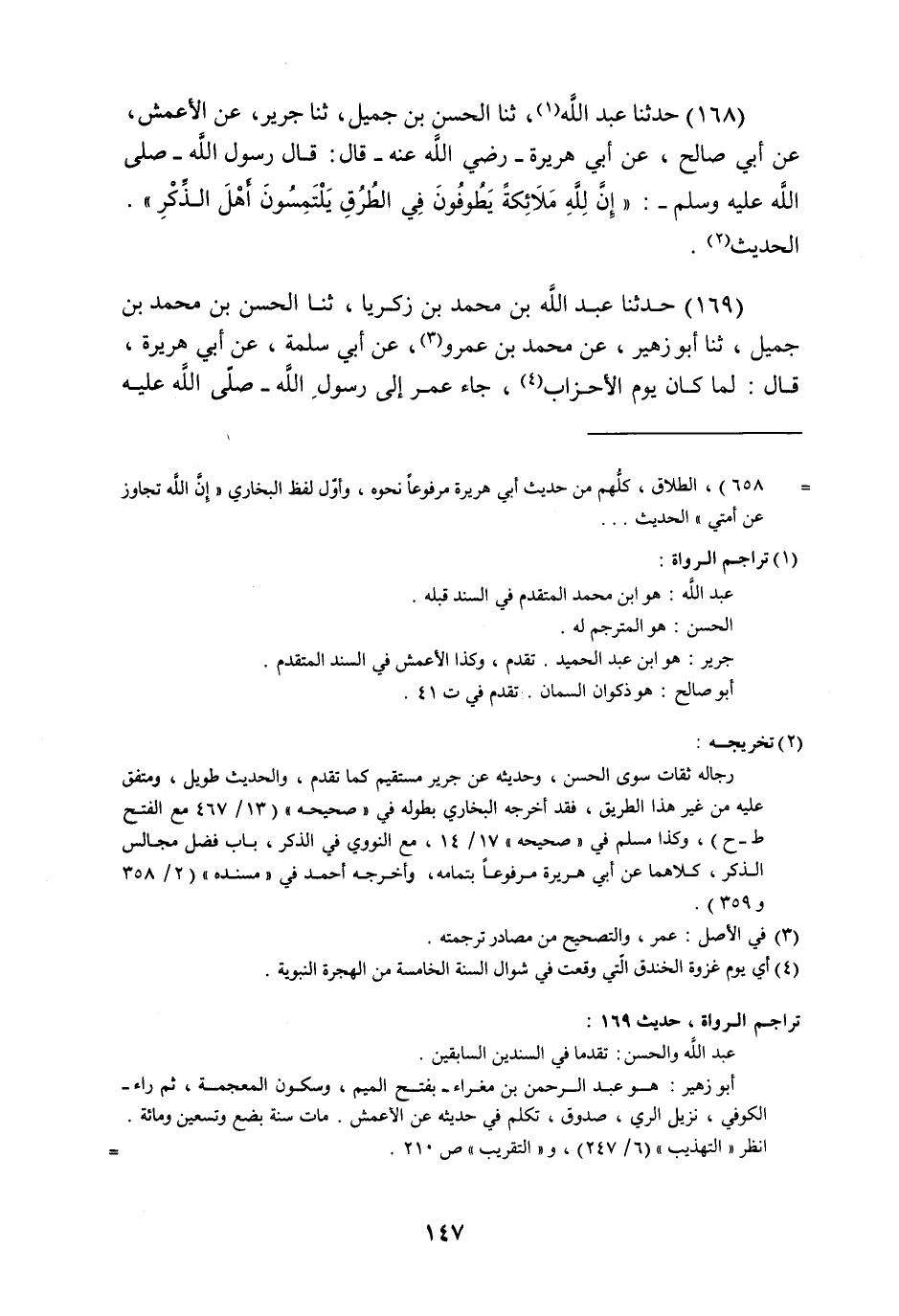 حَدَّثَنَا عَبْدُ اللَّهِ , ثنا الْحَسَنُ بْنُ جَمِيلٍ , ثنا جَرِيرٌ , عَنِ الْأَعْمَشِ , عَنْ أَبِي صَالِحٍ , عَنْ أَبِي هُرَيْرَةَ , رَضِيَ اللَّهُ عَنْهُ قَالَ: قَالَ رَسُولُ اللَّهِ صَلَّى اللهُ عَلَيْهِ وَسَلَّمَ: «إِنَّ §لِلَّهِ مَلَائِكَةً يَطُوفُونَ فِي الطُّرُقِ , يَلْتَمِسُونَ أَهْلَ الذِّكْرِ» الْحَدِيثَ