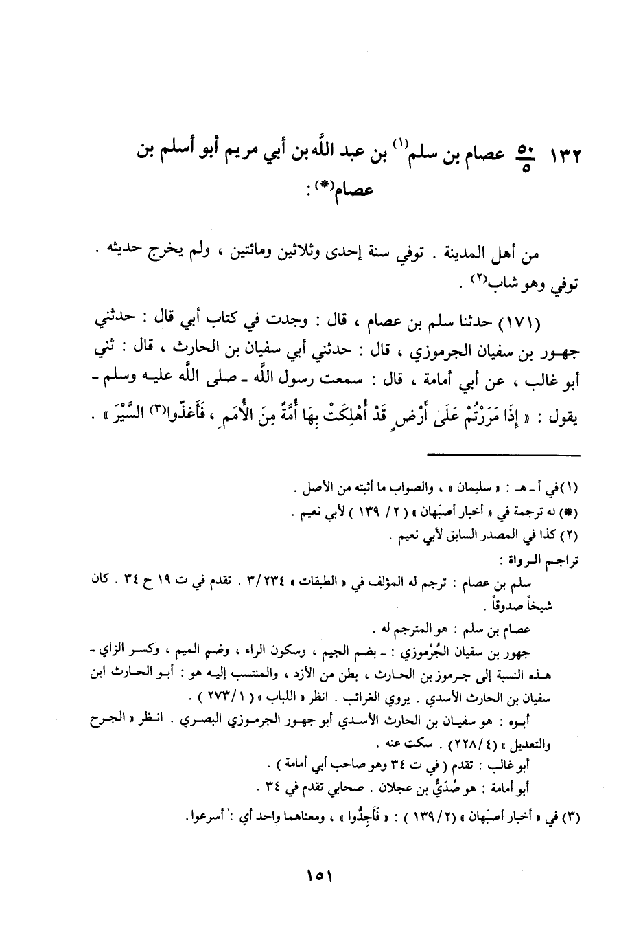 §132 - عِصَامُ بْنُ سَلْمِ بْنِ عَبْدِ اللَّهِ بْنِ أَبِي مَرْيَمَ أَبُو أَسْلَمَ بْنُ عِصَامٍ مِنْ أَهْلِ الْمَدِينَةِ , تُوُفِّيَ سَنَةَ إِحْدَى وَثَلَاثِينَ وَمِائَتَيْنِ , وَلَمْ يُخْرِجْ حَدِيثَهُ , تُوُفِّيَ وَهُوَ شَابٌّ