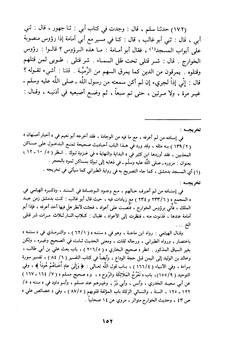 حَدَّثَنَا سَلْمٌ , قَالَ: وَجَدْتُ فِي كِتَابِ أَبِي ,: ثنا جَهْوَرُ , قَالَ: ثني أَبِي قَالَ: ثني أَبُو غَالِبٍ , قَالَ: " كُنَّا فِي مَسِيرٍ مَعَ أَبِي أُمَامَةَ , إِذَا رُءُوسٌ مَنْصُوبَةٌ عَلَى أَبْوَابِ الْمَسْجِدِ , فَقَالَ أَبُو أُمَامَةَ: مَا هَذِهِ الرُّءُوسُ؟ قَالُوا: رُءُوسُ الْخَوَارِجِ , قَالَ: §«شَرُّ قَتْلَى تَحْتَ ظِلِّ السَّمَاءِ , شَرُّ قَتْلَى , طُوبَى لِمَنْ قَتَلَهُمْ وَقَتَلُوهُ , يَمْرُقُونَ مِنَ الدِّينِ كَمَا يَمْرُقُ السَّهْمُ مِنَ الرَّمِيَّةِ» قُلْنَا: أَشَيْءٌ تَقُولُهُ؟ قَالَ: إِنِّي إِذًا لَجَرِيءٌ , إِنْ لَمْ أَكُنْ سَمِعْتُهُ مِنْ رَسُولِ اللَّهِ صَلَّى اللهُ عَلَيْهِ وَسَلَّمَ غَيْرَ مَرَّةً , وَلَا مَرَّتَيْنِ , حَتَّى تَمَّ سَبْعًا , ثُمَّ وَضَعَ أُصْبُعَيْهِ فِي أُذُنَيْهِ وَقَالَ: اصْطَكَّتَا إِنْ لَمْ أَكُنْ سمعتهُ مِنْ رَسُولِ اللَّهِ صَلَّى اللهُ عَلَيْهِ وَسَلَّمَ