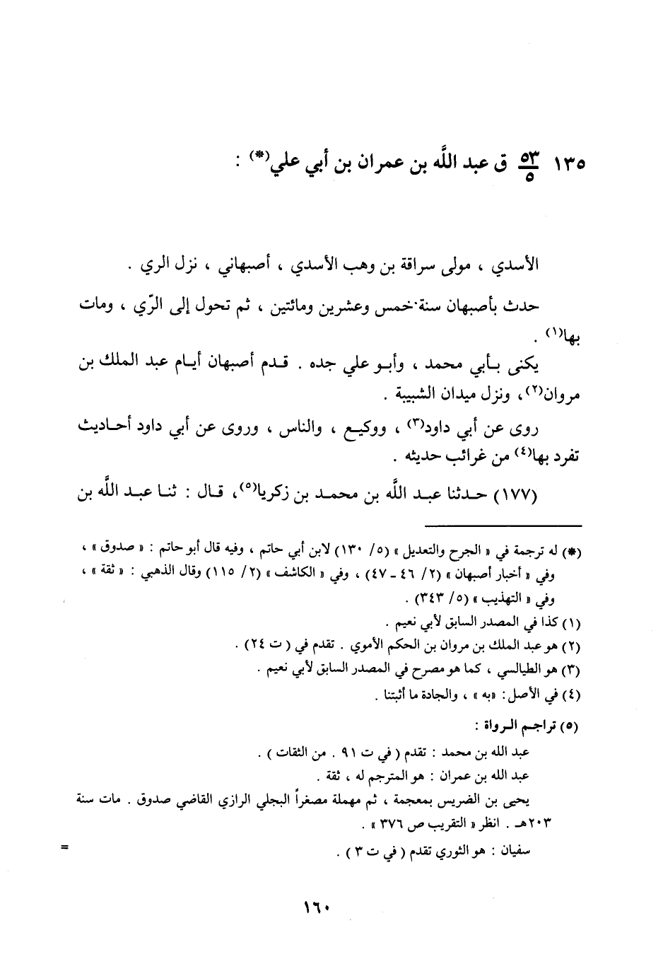 §عَبْدُ اللَّهِ بْنُ عِمْرَانَ بْنِ أَبِي عَلِيٍّ الْأَسَدِيُّ , مَوْلَى سُرَاقَةَ بْنِ وَهْبٍ الْأَسَدِيِّ , أَصْبَهَانِيُّ نَزَلَ الرِّيَّ , حَدَّثَ بأَصْبَهَانَ سَنَةَ خَمْسٍ وَعِشْرِينَ وَمِائَتَيْنِ , ثُمَّ تَحَوَّلَ إِلَى الرِّيِّ وَمَاتَ بِهَا , يُكْنَى بِأَبِي مُحَمَّدٍ , وَأَبُو عَلِيٍّ جَدُّهُ , قَدِمَ أَصْبَهَانَ أَيَّامَ عَبْدِ الْمَلِكِ بْنِ مَرْوَانَ , وَنَزَلَ مَيْدَانَ الشَّبِيبَةِ , رَوَى عَنْ أَبِي دَاوُدَ , وَوَكِيعٍ , وَالنَّاسِ , وَرَوَى عَنْ أَبِي دَاوُدَ أَحَادِيثَ تَفَرَّدَ بِهَا , مِنْ غَرَائِبِ حَدِيثِهِ