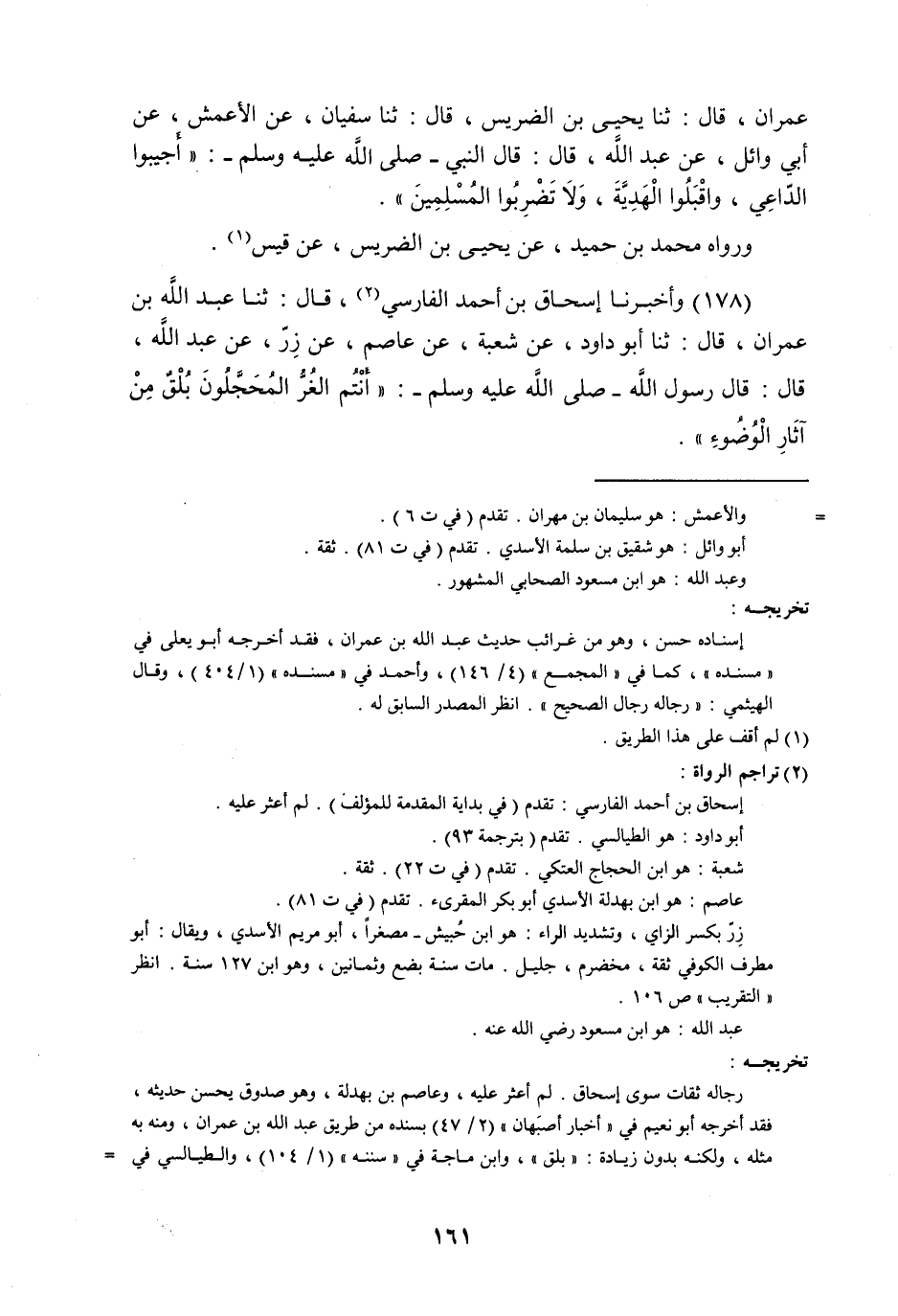 وَأَخْبَرَنَا إِسْحَاقُ بْنُ أَحْمَدَ الْفَارِسِيُّ , قَالَ: ثنا عَبْدُ اللَّهِ بْنُ عِمْرَانَ , قَالَ: ثنا أَبُو دَاوُدَ , عَنْ شُعْبَةَ , عَنْ عَاصِمٍ , عَنْ زِرٍّ , عَنْ عَبْدِ اللَّهِ , قَالَ: قَالَ رَسُولُ اللَّهِ صَلَّى اللهُ عَلَيْهِ وَسَلَّمَ: §«أَنْتُمُ الْغُرُّ الْمُحَجَّلُونَ , بُلْقٌ مِنْ آثَارِ الْوُضُوءِ»