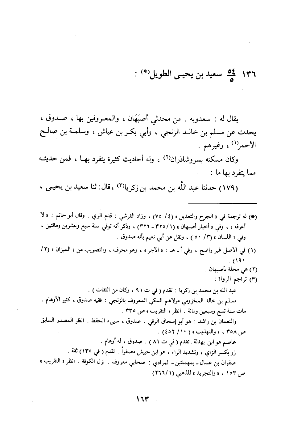 §136 - سَعِيدُ بْنُ يَحْيَى الطَّوِيلُ يُقَالَ لَهُ سَعْدَوَيْهِ , مِنْ مُحَدِّثِي أَصْبَهَانَ , وَالْمَعْرُوفِينَ بِهَا , صَدُوقٌ , يُحَدِّثُ عَنْ مُسْلِمِ بْنِ خَالِدٍ الزَّنْجِيِّ , وَأَبِي بَكْرِ بْنِ عَيَّاشٍ , وَسَلَمَةَ بْنِ صَالِحٍ الْأَحْمَرِ , وَغَيْرِهِمْ , وَكَانَ مَسْكَنُهُ بِسِرْوشَاذَرَانَ , وَلَهُ أَحَادِيثُ كَثِيرَةٌ يَتَفَرَّدُ بِهَا , فَمِنْ حَدِيثِهِ مِمَّا يَتَفَرَّدُ بِهَا، حَدَّثَنَا عَبْدُ اللَّهِ بْنُ مُحَمَّدِ بْنِ زَكَرِيَّا , قَالَ: ثنا سَعِيدُ بْنُ يَحْيَى , قَالَ: ثنا مُسْلِمُ بْنُ خَالِدٍ الزَّنْجِيُّ , عَنِ النُّعْمَانِ بْنِ رَاشِدٍ , عَنْ عَاصِمٍ , عَنْ زِرٍّ , عَنْ صَفْوَانَ بْنِ عَسَّالٍ , عَنِ النَّبِيِّ صَلَّى اللهُ عَلَيْهِ وَسَلَّمَ , «قِصَّةَ الْمَسْحِ» رَأَيْتُ هَذَا الْحَدِيثَ فِي فَوَائِدِ أَبِي بَكْرٍ الْبَرْدِيجِيُّ بِبَغْدَادَ , نَقْلًا عَنْهُ , عَنْ عَبْدِ اللَّهِ بْنِ مُحَمَّدِ بْنِ زَكَرِيَّا , وَكَانَ الْبَرْدِيجِيُّ كَتَبَ عَنْهُ بأَصْبَهَانَ