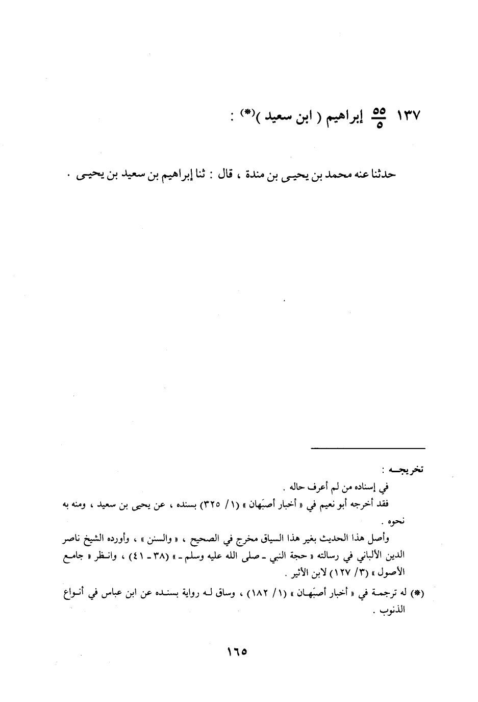 §137 - إِبْرَاهِيمُ بْنُ سَعِيدٍ حَدَّثَنَا عَنْهُ مُحَمَّدُ بْنُ يَحْيَى بْنِ مَنْدَهْ قَالَ: ثنا إِبْرَاهِيمُ بْنُ سَعِيدِ بْنِ يَحْيَى