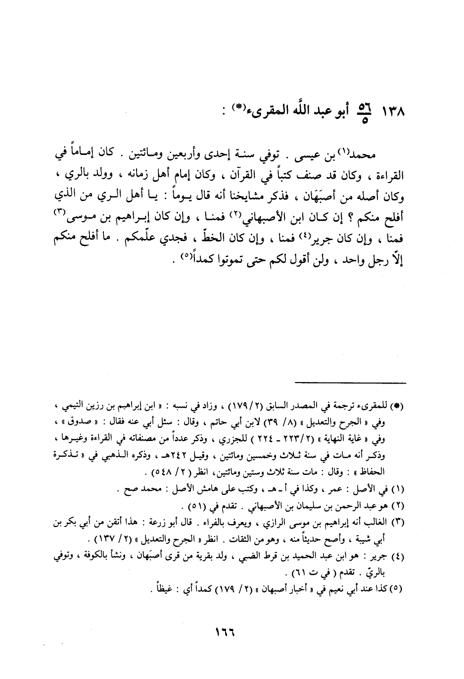 §138 - أَبُو عَبْدِ اللَّهِ الْمُقْرِئُ مُحَمَّدُ بْنُ عِيسَى , تُوُفِّيَ سَنَةَ إِحْدَى وَأَرْبَعِينَ وَمِائَتَيْنِ , كَانَ إِمَامًا فِي الْقِرَاءَةِ , وَكَانَ قَدْ صَنَّفَ كُتُبًا فِي الْقُرْآنِ , وَكَانَ إِمَامَ أَهْلِ زَمَانِهِ , وَوُلِدَ بِالرِّيِّ , وَكَانَ أَصْلُهُ مِنْ أَصْبَهَانَ , فَذَكَرَ مَشَايِخُنَا أَنَّهُ قَالَ يَوْمًا: «يَا أَهْلَ الرِّيِّ , مَنِ الَّذِي أَفْلَحَ مِنْكُمْ , إِنْ كَانَ ابْنُ الْأَصْبَهَانِيِّ فَمِنَّا , وَإِنْ كَانَ إِبْرَاهِيمُ بْنُ مُوسَى فَمِنَّا , وَإِنْ كَانَ جَرِيرٌ فَمِنَّا , وَإِنْ كَانَ الْخَطُّ فَجَدِّي عَلَّمَكُمْ , مَا أَفْلَحَ مِنْكُمْ إِلَّا رَجُلٌ وَاحِدٌ , وَلَنْ أَقُولَ لَكُمْ حَتَّى تَمُوتُوا كَمَدًا» -[167]- وَمِنْ حَدِيثِهِ