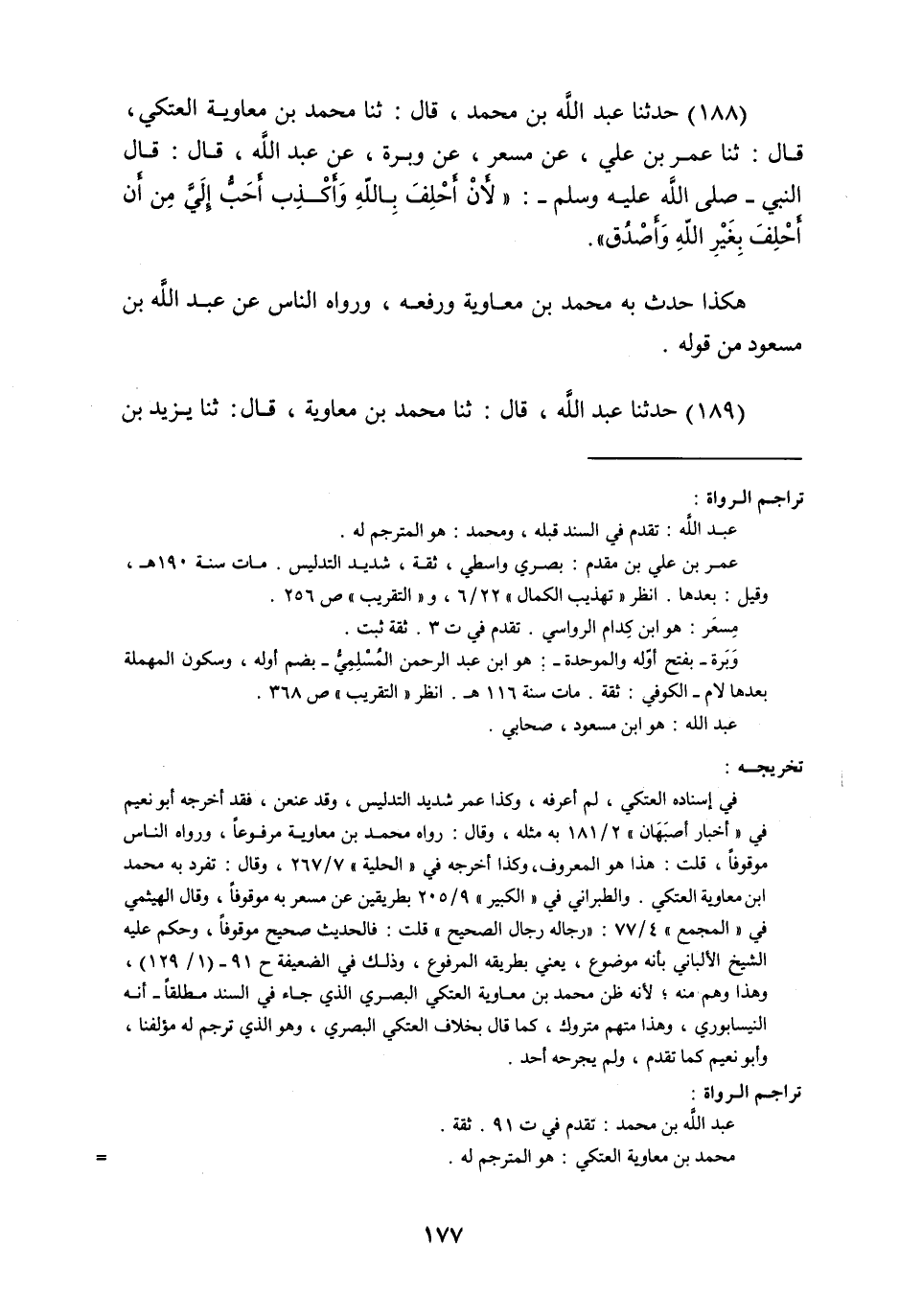 حَدَّثَنَا عَبْدُ اللَّهِ بْنُ مُحَمَّدٍ , قَالَ: ثنا مُحَمَّدُ بْنُ مُعَاوِيَةَ الْعَتَكِيُّ , قَالَ: ثنا عُمَرُ بْنُ عَلِيٍّ , عَنْ مِسْعَرٍ , عَنْ وَبَرَةَ , عَنْ عَبْدِ اللَّهِ , قَالَ: قَالَ النَّبِيُّ صَلَّى اللهُ عَلَيْهِ وَسَلَّمَ: §«لَأَنْ أَحْلِفَ بِاللَّهِ وَأَكْذِبَ أَحَبُّ إِلَيَّ مِنْ أَنْ أَحْلِفَ بِغَيْرِ اللَّهِ وَأَصْدُقَ» هَكَذَا حَدَّثَ بِهِ مُحَمَّدُ بْنُ مُعَاوِيَةَ , وَرَفَعَهُ , وَرَوَاهُ النَّاسُ عَنْ عَبْدِ اللَّهِ بْنِ مَسْعُودٍ مِنْ قَوْلِهِ