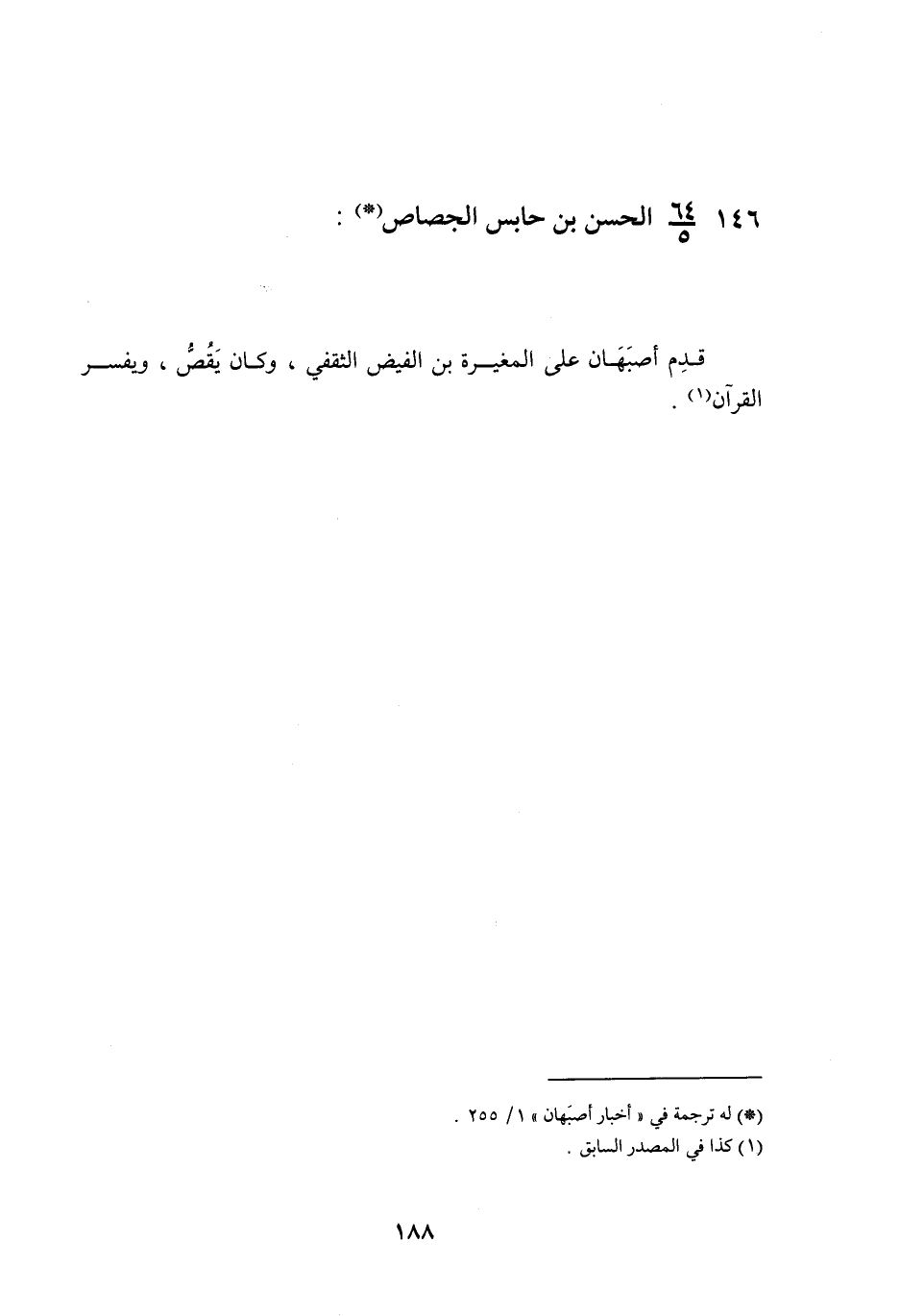 §146 - الْحَسَنُ بْنُ حَابِسٍ الْجَصَّاصُ قَدِمَ أَصْبَهَانَ عَلَى الْمُغِيرَةِ بْنِ الْفَيْضِ الثَّقَفِيِّ , وَكَانَ يَقُصُّ وَيُفَسِّرُ الْقُرْآنَ