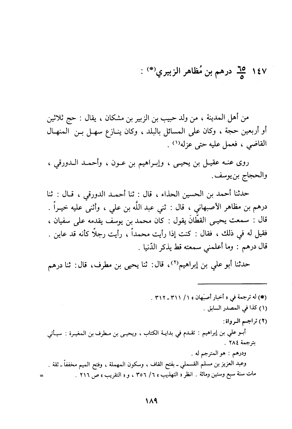 §147 - دِرْهَمُ بْنُ مُظَاهِرٍ الزُّبَيْرِيُّ مِنْ أَهْلِ الْمَدِينَةِ , مِنْ وَلَدِ حَبِيبِ بْنِ الزُّبَيْرِ بْنِ مُشْكَانَ , يُقَالَ حَجَّ ثَلَاثِينَ , أَوْ أَرْبَعِينَ حِجَّةً , وَكَانَ عَلَى الْمَسَائِلِ بِالْبَلَدِ , وَكَانَ يُنَازِعُ سَهْلَ بْنَ الْمِنْهَالِ الْقَاضِيَ , فَعَمِلَ عَلَيْهِ حَتَّى عَزَلَهُ , رَوَى عَنْهُ عَقِيلُ بْنُ يَحْيَى , وَإِبْرَاهِيمُ بْنُ عَوْنٍ , وَأَحْمَدُ الدَّوْرَقِيُّ , وَالْحَجَّاجُ بْنُ يُوسُفَ