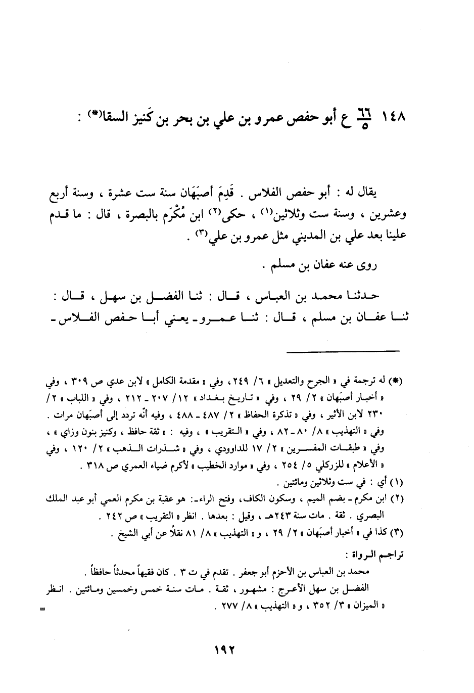 حَدَّثَنَا مُحَمَّدُ بْنُ الْعَبَّاسِ , قَالَ: ثنا الْفَضْلُ بْنُ سَهْلٍ , قَالَ: ثنا عَفَّانُ بْنُ مُسْلِمٍ , قَالَ: ثنا عَمْرٌو يَعْنِي أَبَا حَفْصٍ الْفَلَّاسَ , -[193]- قَالَ: ثنا خَالِدُ بْنُ الْحَارِثِ , عَنْ شُعْبَةَ , عَنْ خَالِدٍ الْحَذَّاءِ , عَنِ ابْنِ سِيرِينَ , أَنَّ عُمَرَ , §«كَتَبَ إِلَى أَبِي مُوسَى الْأَشْعَرِيِّ فِي عِشْرِينَ تِجْفَافًا أَنْ يُفَرِّقَهَا فِي أَشْجَعِ حَيٍّ بِالْبَصْرَةِ , فَفَرَّقَهَا فِي بَنِي رِيَاحٍ» التِّجْفَافُ: الْقَلُوصُ " حَدَّثَنِي أَبِي رَحِمَهُ اللَّهُ تَعَالَى قَالَ: ثنا أَحْمَدُ بْنُ مَهْدِيٍّ قَالَ: قَدِمَ أَبُو حَفْصٍ مِنْ أَصْبَهَانَ , فَذُكِرَ لِأَبِي النُّعْمَانِ عَارِمٍ فَقَالَ: قَدِمَ أَبُو حَفْصٍ مِنْ أَصْبَهَانَ , وَحَمَلَ خَمْسَةَ آلَافِ دِرْهَمٍ , فَقَالَ: هَاجَرَ أَبُو دَاوُدَ إِلَى أَصْبَهَانَ وَصَيَّرُوهَا دَارَ هِجْرَةٍ , قَالَ الْمِسُوحِيُّ: سَأَلْتُ أَبَا زُرْعَةَ عَنْ عَمْرِو بْنِ عَلِيٍّ -[194]- فَقَالَ: ذَاكَ مِنْ فُرْسَانِ الْحَدِيثِ , وَقَالَ حَجَّاجُ بْنُ الشَّاعِرِ: لَا يُبَالِي أَبِي: يَأْخُذُ عَنْ عَمْرِو بْنِ عَلِيٍّ مِنْ حِفْظِهِ , أَوْ مِنْ كِتَابِهِ حَكَى مُحَمَّدُ بْنُ يَحْيَى بْنِ مَنْدَهْ قَالَ: سَمِعْتُ أَبَا حَفْصٍ يَقُولُ: كَتَبَ إِلَيَّ رَجُلٌ فِي رُقْعَةٍ: «بِسْمِ اللَّهِ الرَّحْمَنِ الرَّحِيمِ , اطْلُبِ الدُّنْيَا عَلَى قَدْرِ مُكْثِكَ فِيهَا , وَاطْلُبِ الْآخِرَةَ عَلَى قَدْرِ حَاجَتِكَ إِلَيْهَا , وَالسَّلَامُ»