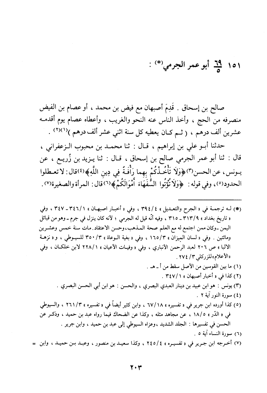 §151 - أَبُو عُمَرَ الْجَرْمِيُّ صَالِحُ بْنُ إِسْحَاقَ قَدِمَ أَصْبَهَانَ مَعَ فَيْضِ بْنِ مُحَمَّدٍ , أَوْ عِصَامِ بْنِ الْفَيْضِ , مُنْصَرَفَهُ مِنَ الْحَجِّ , وَأَخَذَ النَّاسُ عَنْهُ النَّحْوَ وَالْغَرِيبَ , وَأَعْطَاهُ عِصَامٌ يَوْمَ أَقْدَمَهُ عِشْرِينَ أَلْفَ دِرْهَمٍ , ثُمَّ كَانَ يُعْطِيهِ كُلَّ سَنَةٍ اثْنَيْ عَشَرَ أَلْفَ دِرْهَمٍ