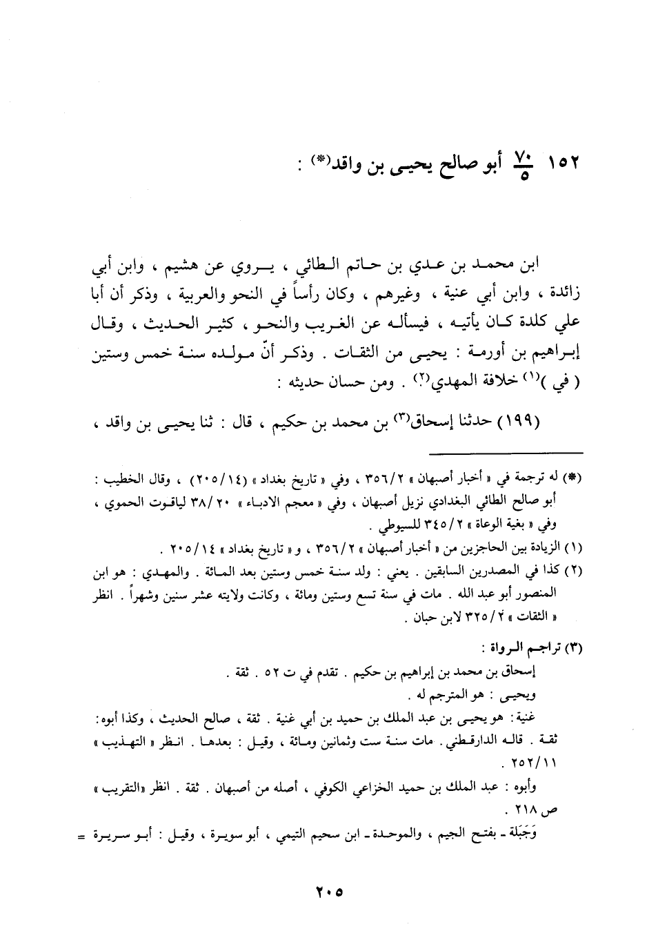 §152 - أَبُو صَالِحٍ يَحْيَى بْنُ وَاقِدِ بْنِ مُحَمَّدِ بْنِ عَدِيِّ بْنِ حَاتِمٍ الطَّائِيِّ يَرْوِي عَنْ هُشَيْمٍ , وَابْنِ أَبِي زَائِدَةَ , وَابْنِ أَبِي عَنِيَّةَ , وَغَيْرِهِمْ , وَكَانَ رَأْسًا فِي النَّحْوِ وَالْعَرَبِيَّةِ , وَذَكَرَ أَنَّ أَبَا عَلِيٍّ كَلَدَةَ كَانَ يَأْتِيهِ فَيَسْأَلُهُ عَنِ الْغَرِيبِ وَالنَّحْوِ , كَثِيرُ الْحَدِيثِ , وَقَالَ إِبْرَاهِيمُ بْنُ أُورُمَةَ: يَحْيَى مِنَ الثِّقَاتِ , وَذَكَرَ أَنَّ مَوْلِدَهُ سَنَةَ خَمْسٍ وَسِتِّينَ فِي خِلَافَةِ الْمَهْدِيِّ , وَمِنْ حِسَانِ حَدِيثِهِ