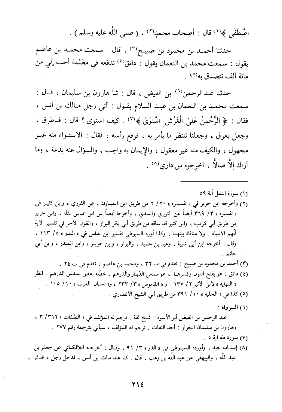 حَدَّثَنَا عَبْدُ الرَّحْمَنِ بْنُ الْفَيْضِ , قَالَ: ثنا هَارُونُ بْنُ سُلَيْمَانَ , قَالَ: سَمِعْتُ مُحَمَّدَ بْنَ النُّعْمَانِ بْنِ عَبْدِ السَّلَامِ , يَقُولُ: أَتَى رَجُلٌ مَالِكَ بْنَ أَنَسٍ فَقَالَ: {§الرَّحْمَنُ عَلَى الْعَرْشِ اسْتَوَى} [طه: 5] , كَيْفَ اسْتَوَى؟ قَالَ: فَأَطْرَقَ وَجَعَلَ يَعْرَقُ , وَجَعَلْنَا نَنْتَظِرُ مَا يَأْمُرُ بِهِ , فَرَفَعَ رَأْسَهُ فَقَالَ: «الِاسْتِوَاءُ مِنْهُ غَيْرُ مَجْهُولٍ , وَالْكَيْفُ مِنْهُ غَيْرُ مَعْقُولٍ , وَالْإِيمَانُ بِهِ وَاجِبٌ , وَالسُّؤَالُ عَنْهُ بِدْعَةٌ , وَمَا أَرَاكَ إِلَّا ضَالًّا , أَخْرِجُوهُ مِنْ دَارِي» حُكِيَ أَنَّهُ كَانَ أَبْيَضَ الرَّأْسِ وَاللِّحْيَةِ , وَكُمُّ قَمِيصِهِ إِلَى أَطْرَافِ أَصَابِعِهِ , وَثِيَابُهُ خَشِنٌ , ثُمَّ وَصَفُّوا لَهُ التَّنَعُّمَ , وَأَنَّهُ إِنْ لَمْ يَفْعَلْ خِيفَ عَلَى عَقْلِهِ , قَالَ: فَكَانَ بَعْدَ ذَاكَ يَلْبَسُ الثِّيَابَ الْفَاخِرَةَ , وَيَتَغَلَّفُ بِالْغَالِيَةِ الْجَيِّدَةِ وَذَكَرَ الْعَبَّاسُ بْنُ حَمْدَانَ قَالَ: ثنا زَيْدُ بْنُ أَخْزَمَ قَالَ: ثنا عَابِدُ أَهْلِ أَصْبَهَانَ مُحَمَّدُ بْنُ النُّعْمَانِ