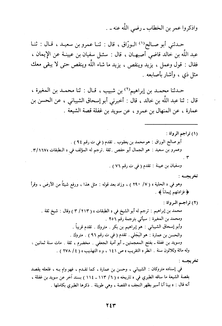 حَدَّثَنِي أَبُو صَالِحٍ الْوَرَّاقُ , قَالَ: ثنا عَمْرُو بْنُ سَعِيدٍ , قَالَ: ثنا عَبْدُ اللَّهِ بْنُ خَالِدٍ , قَاضِي أَصْبَهَانَ قَالَ: سُئِلَ سُفْيَانُ بْنُ عُيَيْنَةَ , عَنِ الْإِيمَانِ , فَقَالَ: §«قَوْلٌ وَعَمَلٌ , يَزِيدُ وَيَنْقُصُ , يَزِيدُ مَا شَاءَ اللَّهُ , وَيَنْقُصُ حَتَّى لَا يَبْقَى مَعَكَ مِثْلُ ذِي , وَأَشَارَ بِأَصَابِعِهِ» حَدَّثَنَا مُحَمَّدُ بْنُ إِبْرَاهِيمَ بْنِ شَبِيبٍ , قَالَ: ثنا مُحَمَّدُ بْنُ الْمُغِيرَةِ , قَالَ: ثنا عَبْدُ اللَّهِ بْنُ خَالِدٍ , قَالَ: أَخْبَرَنِي أَبُو إِسْحَاقَ الشَّيْبَانِيُّ , عَنِ الْحَسَنِ بْنِ عُمَارَةَ , عَنِ الْمِنْهَالِ بْنِ عَمْرٍو , عَنْ سُوَيْدِ بْنِ غَفَلَةَ , قِصَّةَ الشِّيعَةِ "