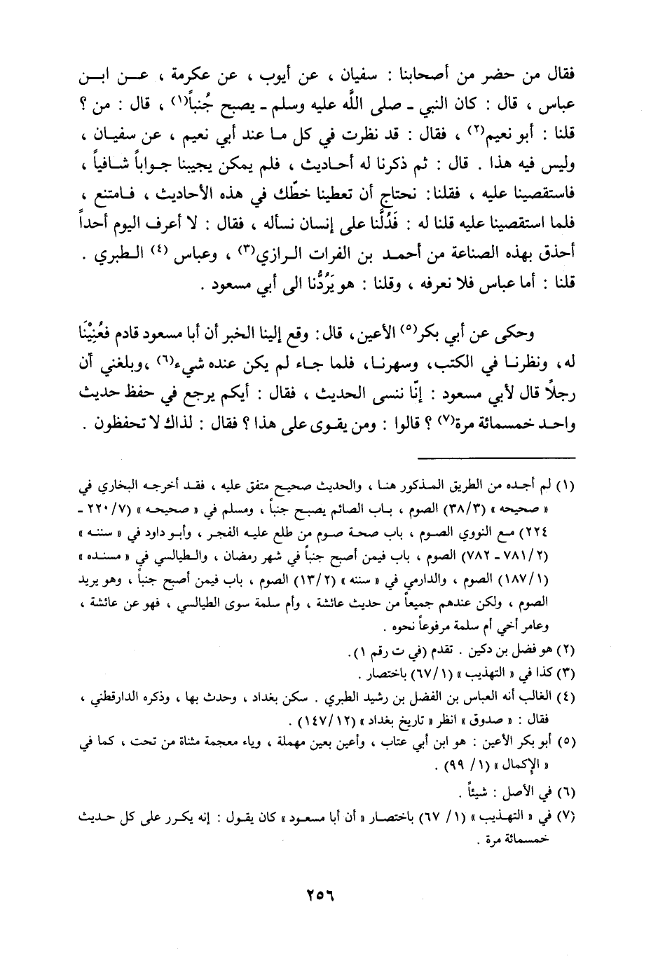 فَقَالَ مَنْ حَضَرَ مِنْ أَصْحَابِنَا: سُفْيَانُ , عَنْ أَيُّوبَ , عَنْ عِكْرِمَةَ , عَنِ ابْنِ عَبَّاسٍ قَالَ: §«كَانَ النَّبِيُّ صَلَّى اللهُ عَلَيْهِ وَسَلَّمَ يُصْبِحُ جُنُبًا» , قَالَ: مَنْ؟ قُلْنَا: أَبُو نُعَيْمٍ , فَقَالَ: قَدْ نَظَرْتُ فِي كُلِّ مَا عِنْدَ أَبِي نُعَيْمٍ عَنْ سُفْيَانَ , وَلَيْسَ فِيهِ هَذَا. قَالَ: ثُمَّ ذَكَرْنَا لَهُ أَحَادِيثَ , فَلَمْ يَكُنْ يُجِيبُنَا جَوَابًا شَافِيًا , فَاسْتَقْصَيْنَا عَلَيْهِ فَقُلْنَا: نَحْتَاجُ أَنْ تُعْطِيَنَا خَطَّكَ فِي هَذِهِ الْأَحَادِيثِ , فَامْتَنَعَ , فَلَمَّا اسْتَقْصَيْنَا عَلَيْهِ قُلْنَا لَهُ , فَدَلَّنَا عَلَى إِنْسَانٍ نَسْأَلُهُ , فَقَالَ: «لَا أَعْرِفُ الْيَوْمَ أَحَدًا أَحْذَقَ بِهَذِهِ الصِّنَاعَةِ مِنْ أَحْمَدَ بْنِ الْفُرَاتِ الرَّازِيِّ , وَعَبَّاسٍ الطَّبَرِيِّ» , قُلْنَا: أَمَّا عَبَّاسٌ فَلَا نَعْرِفُهُ , وَقُلْنَا: هُوَ يَرُدُّنَا إِلَى أَبِي مَسْعُودٍ وَحُكِيَ عَنْ أَبِي بَكْرٍ الْأَعْيَنِ قَالَ: وَقَعَ إِلَيْنَا الْخَبَرُ أَنَّ أَبَا مَسْعُودٍ قَادِمٌ فَعُنِينَا لَهُ , وَنَظَرْنَا فِي الْكُتُبِ , وَسَهِرْنَا , فَلَمَّا جَاءَ لَمْ يَكُنْ عِنْدَهُ شَيْءٌ , وَبَلَغَنِي أَنَّ رَجُلًا قَالَ لِأَبِي مَسْعُودٍ: إِنَّا نَنْسَى الْحَدِيثَ , فَقَالَ: " أَيُّكُمْ يَرْجِعُ فِي حِفْظِ حَدِيثٍ وَاحِدٍ خَمْسَمِائَةِ مَرَّةٍ؟ قَالُوا: وَمَنْ يَقْوَى عَلَى هَذَا؟ فَقَالَ: لِذَاكَ لَا تَحْفَظُونَ "