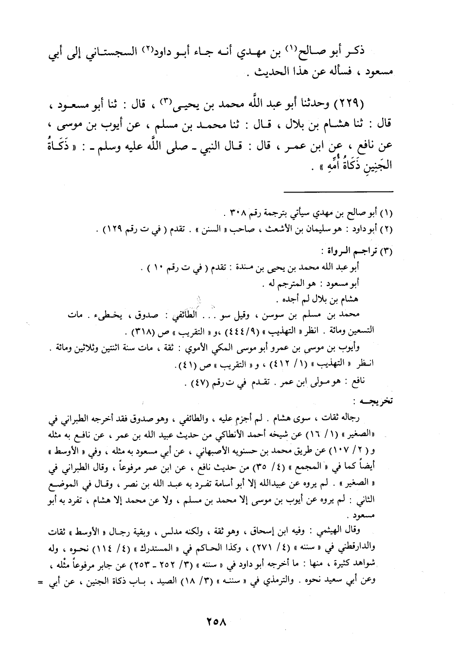وَحَدَّثَنَا أَبُو عَبْدِ اللَّهِ مُحَمَّدُ بْنُ يَحْيَى , قَالَ: ثنا أَبُو مَسْعُودٍ , قَالَ: ثنا هِشَامُ بْنُ بِلَالٍ , قَالَ: ثنا مُحَمَّدُ بْنُ مُسْلِمٍ , عَنْ أَيُّوبَ بْنِ مُوسَى , عَنْ نَافِعٍ , عَنِ ابْنِ عُمَرَ , قَالَ: قَالَ النَّبِيُّ صَلَّى اللهُ عَلَيْهِ وَسَلَّمَ: §«ذَكَاةُ الْجَنِينِ ذَكَاةُ أُمِّهِ»