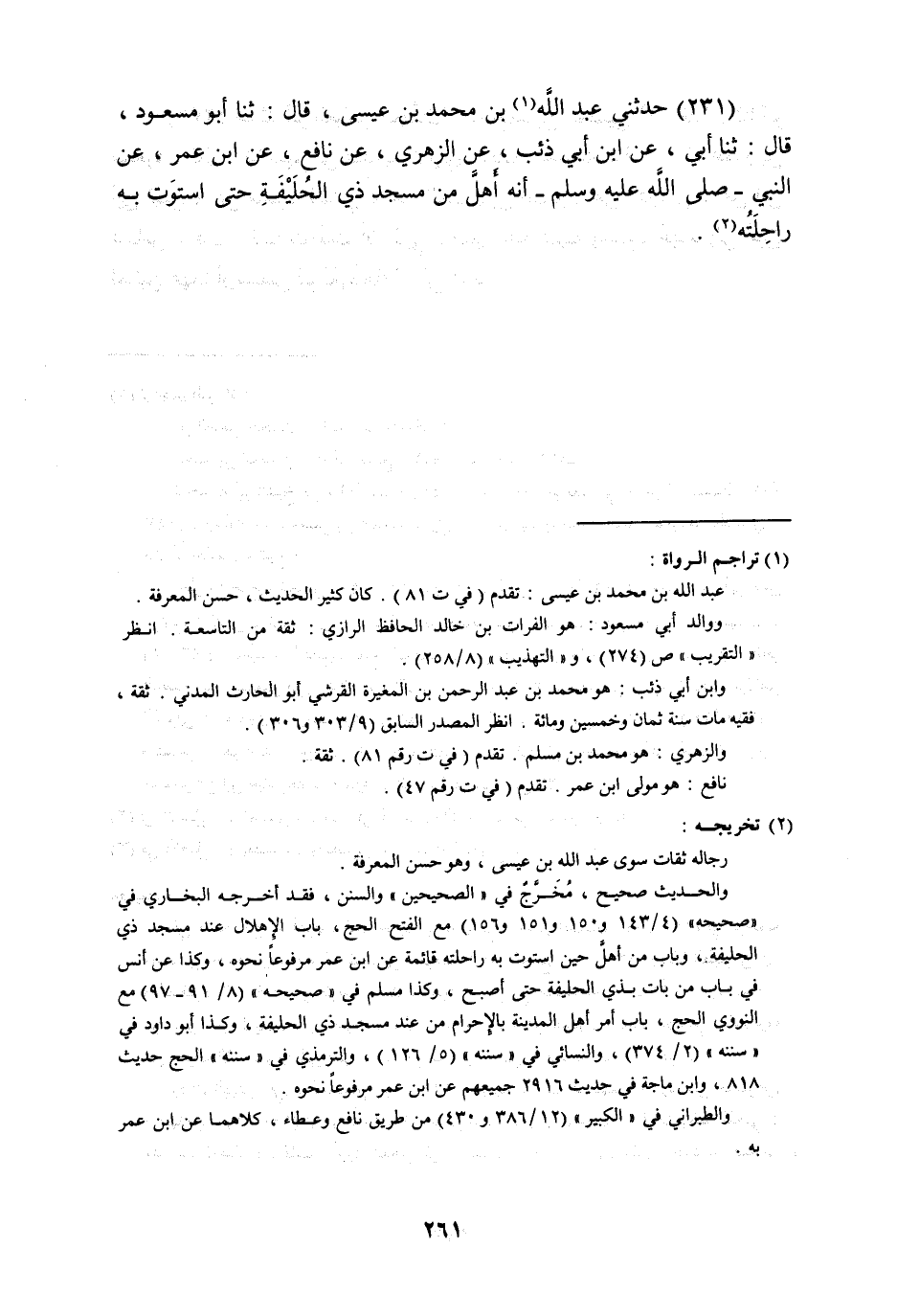 حَدَّثَنِي عَبْدُ اللَّهِ بْنُ مُحَمَّدِ بْنِ عِيسَى , قَالَ: ثنا أَبُو مَسْعُودٍ , قَالَ: ثنا أَبِي , عَنِ ابْنِ أَبِي ذِئْبٍ , عَنِ الزُّهْرِيِّ , عَنْ نَافِعٍ , عَنِ ابْنِ عُمَرَ , عَنِ النَّبِيِّ صَلَّى اللهُ عَلَيْهِ وَسَلَّمَ , أَنَّهُ §«أَهَلَّ مِنْ مَسْجِدِ ذِي الْحُلَيْفَةِ حَتَّى اسْتَوَتْ بِهِ رَاحِلَتُهُ»