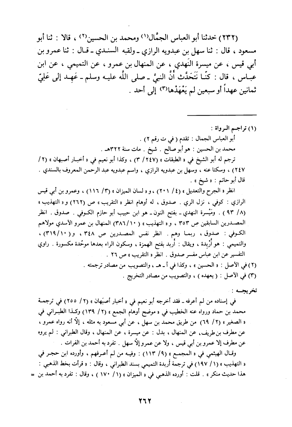 حَدَّثَنَا أَبُو الْعَبَّاسِ الْجَمَّالُ , وَمُحَمَّدُ بْنُ الْحُسَيْنِ , قَالَا: ثنا أَبُو مَسْعُودٍ , قَالَ: ثنا سَهْلُ بْنُ عَبْدُوَيْهِ الرَّازِيُّ وَلَقَبُهُ السِّنْدِيُّ , قَالَ: ثنا عَمْرُو بْنُ أَبِي قَيْسٍ , عَنْ مَيْسَرَةَ النَّهْدِيِّ , عَنِ الْمِنْهَالِ بْنِ عَمْرٍو , عَنِ التَّمِيمِيِّ , عَنِ ابْنِ عَبَّاسٍ , قَالَ: كُنَّا نَتَحَدَّثُ أَنَّ النَّبِيَّ صَلَّى اللهُ عَلَيْهِ وَسَلَّمَ §«عَهِدَ إِلَى عَلِيٍّ ثَمَانِينَ عَهْدًا , أَوْ سَبْعِينَ , لَمْ يَعْهَدْهَا إِلَى أَحَدٍ»