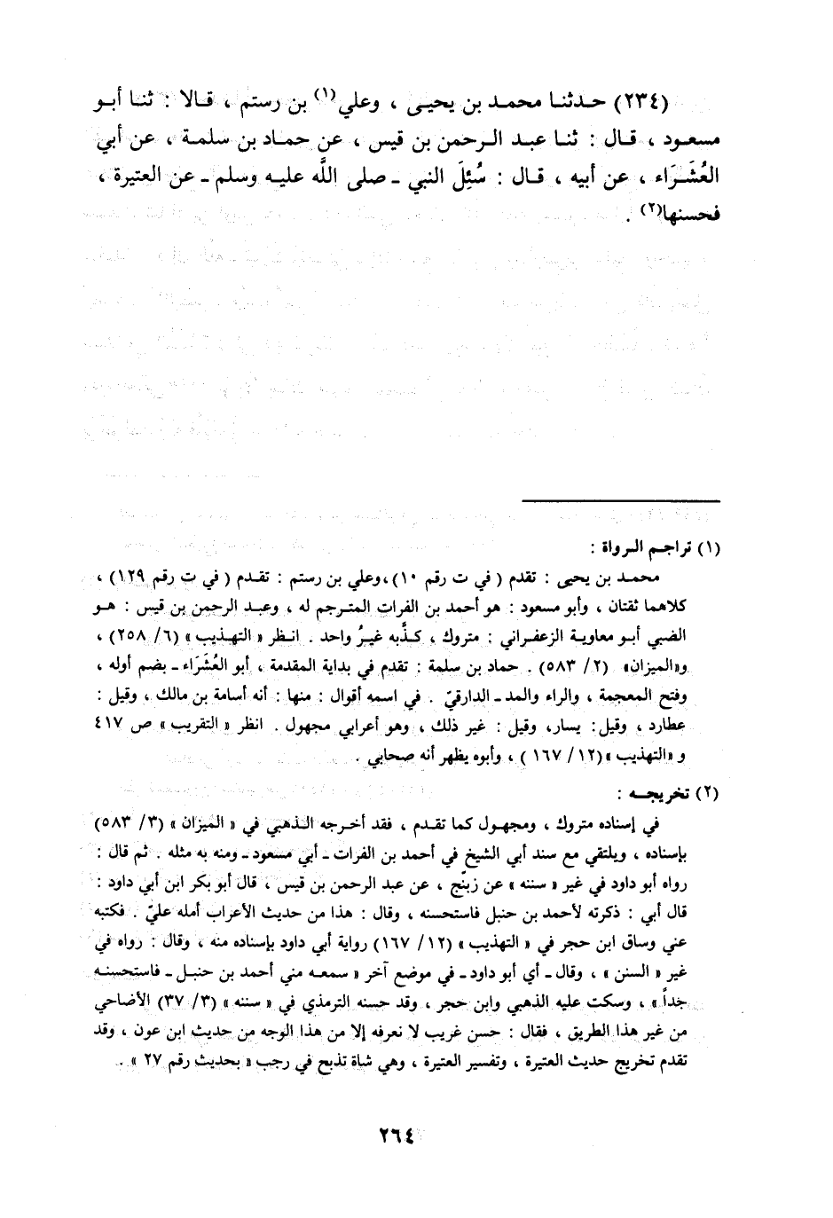 حَدَّثَنَا مُحَمَّدُ بْنُ يَحْيَى , وَعَلِيُّ بْنُ رُسْتُمَ , قَالَا: ثنا أَبُو مَسْعُودٍ , قَالَ: ثنا عَبْدُ الرَّحْمَنِ بْنُ قَيْسٍ , عَنْ حَمَّادِ بْنِ سَلَمَةَ , عَنْ أَبِي الْعُشَرَاءِ , عَنْ أَبِيهِ , قَالَ: §«سُئِلَ النَّبِيُّ صَلَّى اللهُ عَلَيْهِ وَسَلَّمَ عَنِ الْعَتِيرَةِ فَحَسَّنَهَا»