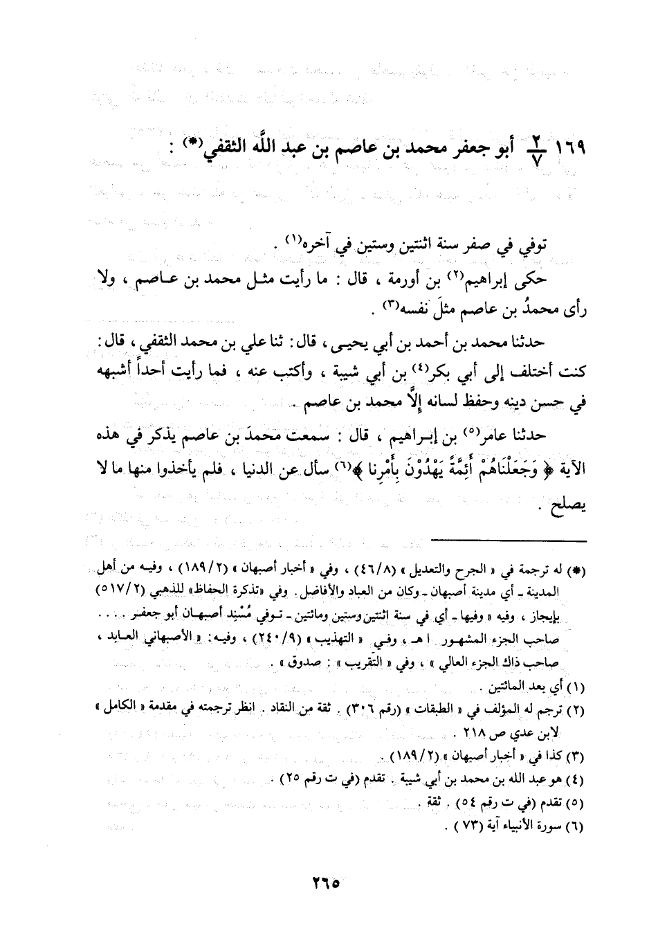 §169 - أَبُو جَعْفَرٍ مُحَمَّدُ بْنُ عَاصِمِ بْنِ عَبْدِ اللَّهِ الثَّقَفِيُّ تُوُفِّيَ فِي صَفَرٍ سَنَةَ اثْنَتَيْنِ وَسِتِّينَ فِي آخِرِهِ حَكَى إِبْرَاهِيمُ بْنُ أُورُمَةَ قَالَ: مَا رَأَيْتُ مِثْلَ مُحَمَّدِ بْنِ عَاصِمٍ , وَلَا رَأَى مُحَمَّدُ بْنُ عَاصِمٍ مِثْلَ نَفْسِهِ