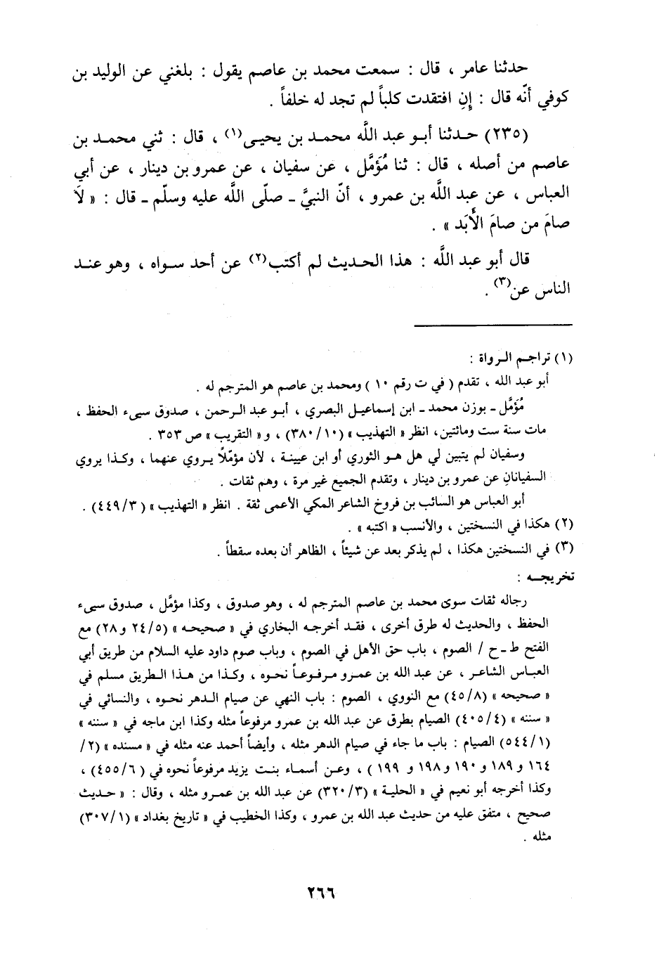 حَدَّثَنَا أَبُو عَبْدِ اللَّهِ مُحَمَّدُ بْنُ يَحْيَى , قَالَ: ثني مُحَمَّدُ بْنُ عَاصِمٍ , مِنْ أَصْلِهِ قَالَ: ثنا مُؤَمَّلٌ , عَنْ سُفْيَانَ , عَنْ عَمْرِو بْنِ دِينَارٍ , عَنْ أَبِي الْعَبَّاسِ , عَنْ عَبْدِ اللَّهِ بْنِ عَمْرٍو , أَنَّ النَّبِيَّ صَلَّى اللهُ عَلَيْهِ وَسَلَّمَ قَالَ: §«لَا صَامَ مَنْ صَامَ الْأَبَدَ» قَالَ أَبُو عَبْدِ اللَّهِ: هَذَا الْحَدِيثُ لَمْ أَكْتُبْ عَنْ أَحَدٍ سِوَاهُ , وَهُوَ عِنْدَ النَّاسِ عَنْ