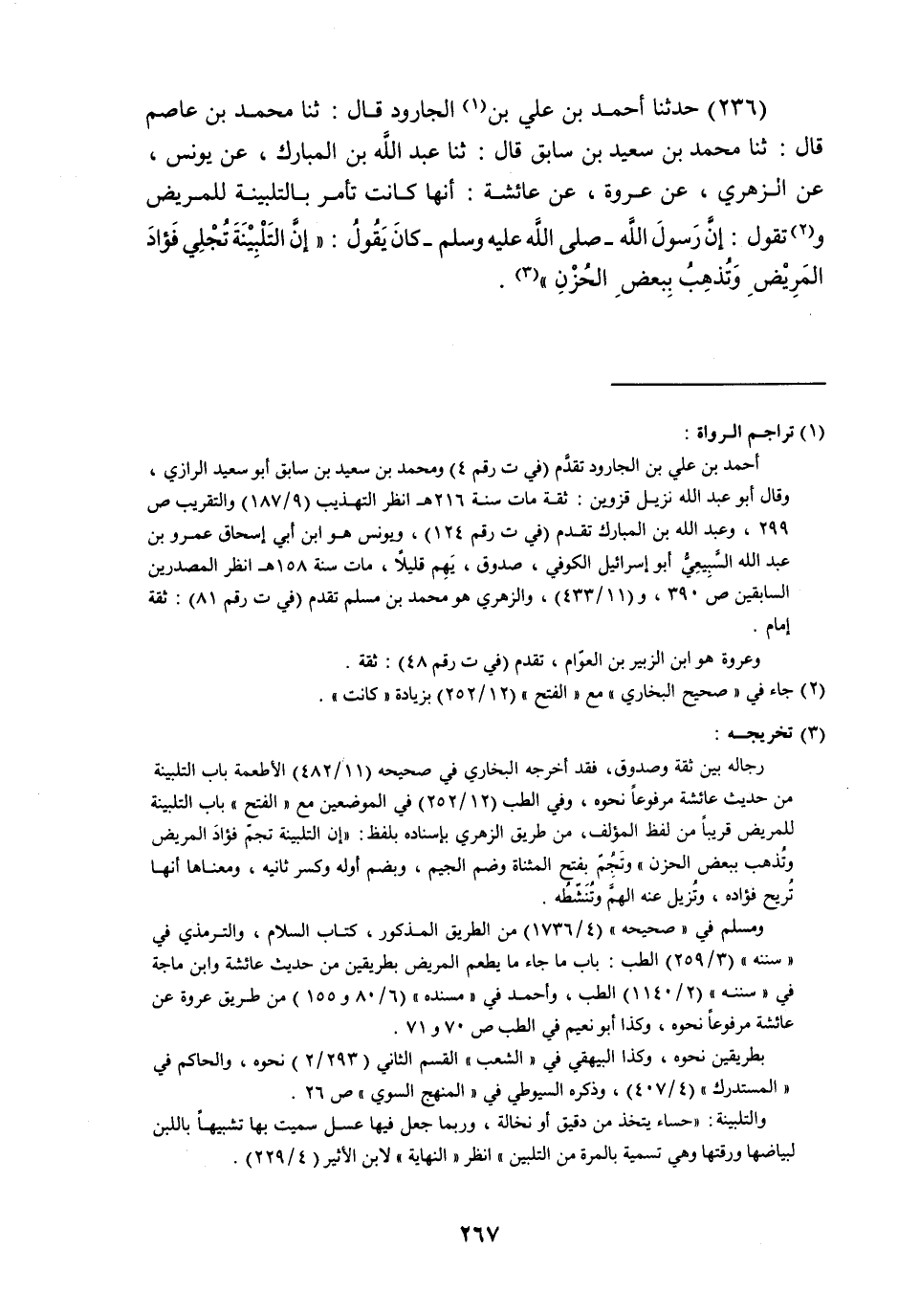 حَدَّثَنَا أَحْمَدُ بْنُ عَلِيِّ بْنِ الْجَارُودِ , قَالَ: ثنا مُحَمَّدُ بْنُ عَاصِمٍ , قَالَ: ثنا مُحَمَّدُ بْنُ سَعِيدِ بْنِ سَابِقٍ , قَالَ: ثنا عَبْدُ اللَّهِ بْنُ الْمُبَارَكِ , عَنْ يُونُسَ , عَنِ الزُّهْرِيِّ , عَنْ عُرْوَةَ , عَنْ عَائِشَةَ , أَنَّهَا كَانَتْ تَأْمُرُ بِالتَّلْبِينَةِ لِلْمَرِيضِ وَتَقُولُ: إِنَّ رَسُولَ اللَّهِ صَلَّى اللهُ عَلَيْهِ وَسَلَّمَ كَانَ يَقُولُ: «إِنَّ §التَّلْبِينَةَ تُجْلِي فُؤَادَ الْمَرِيضِ , وَتَذْهَبُ بِبَعْضِ الْحُزْنِ»