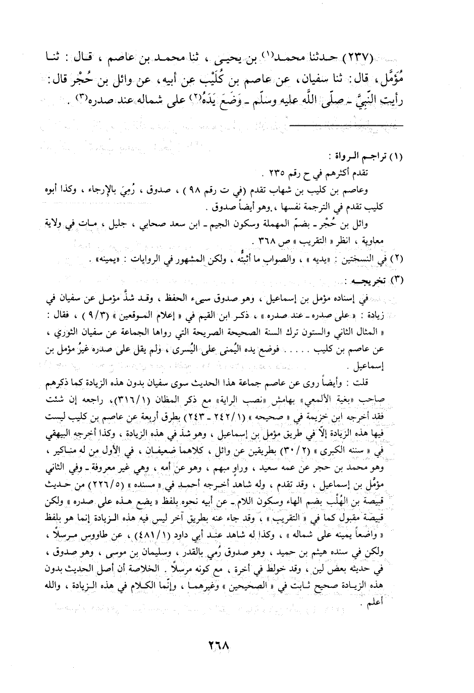 حَدَّثَنَا مُحَمَّدُ بْنُ يَحْيَى , ثنا مُحَمَّدُ بْنُ عَاصِمٍ , قَالَ: ثنا مُؤَمَّلٌ , قَالَ: ثنا سُفْيَانُ , عَنْ عَاصِمِ بْنِ كُلَيْبٍ , عَنْ أَبِيهِ , عَنْ وَائِلِ بْنِ حُجْرٍ , قَالَ: رَأَيْتُ النَّبِيَّ صَلَّى اللهُ عَلَيْهِ وَسَلَّمَ §«وَضَعَ يَدَهُ عَلَى شِمَالِهِ عِنْدَ صَدْرِهِ»